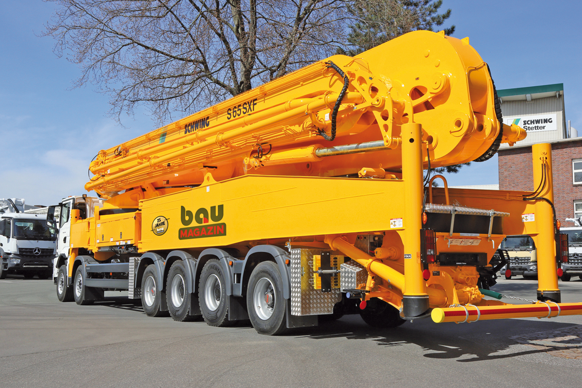 Die SCHWING-Stetter Gruppe gratuliert dem bauMAGAZIN zu 25 Jahren kritischem, investigativem und informativem Journalismus mit unserer größten serienmäßigen Autobetonpumpe S 65 SXF in der Special-Edition ›25 Jahre bauMAGAZIN‹.« Schwing-Stetter Gruppe (Herne)