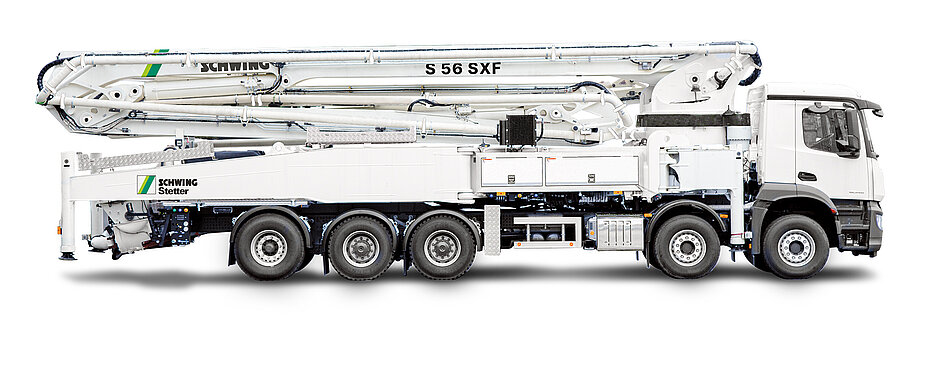 Die S 56 SXF kommt ohne mehrfach teleskopierbare Abstützung aus, die von Schwing entwickelte SXF-Abstützung kombiniert vielmehr die bewährte, einteilige SX-Abstützung mit einem klappbaren Stützbein. Als Vorteile gegenüber mehrfach teleskopierbaren Abstützungen nennt Schwing einen reduzierten Wartungsaufwand, eine erhöhte Stabilität und mehr Ruhe beim Pumpen. Für optimalen Schutz vor Beschädigungen soll die geschützte Kolbenstange sorgen.