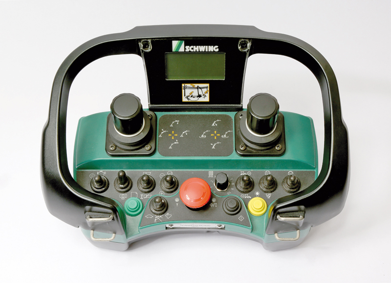 Ein ergonomisches Design und niedriges Gewicht erlauben, auch längere Einsätze mit der Funk-Fernsteuerung SC 30 ermüdungsarm und konzentriert zu meistern. Leistungsstarke Akkus sollen dabei eine Einsatzzeit von mindestens acht Stunden garantieren. Optional bietet der Hersteller auch die neue Fernsteuerung SC 50 an: Diese proportionale »Schwing Control 50 colour« verfügt über zwei Joysticks und ein Farb-Display zum Ablesen der für den Betrieb wichtigsten Daten sowie von aktuellen Statusmeldungen und erlaubt eine schnelle wie auch intuitive Navigation durch das Menu über acht Soft-Key-Tasten. Die SC 50 ermöglicht den kabellosen Betrieb und den kabelgebundenen Betrieb über ein serienmäßiges 20-m-Kabel.