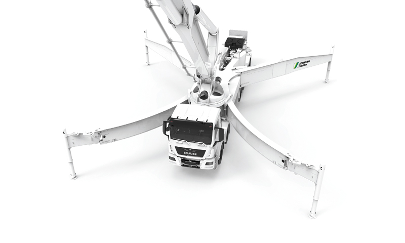 Der 5-teilige Mast der S 56 SXF mit Rollfaltung unterstützt dank einer besonderen Kinematik eine deutlich kürzere Aufstellzeit, um somit eine maximale Flexibilität für jede Baustelle zu bieten. Die Bogenabstützung von Schwing ermöglicht den Einsatz der Langhub-Pumpenbatterie P2525 mit 2,5 m langen Förderzylindern. Als Plus nennt Schwing mehr Laufruhe im Betrieb sowie eine deutlich reduzierte Hubanzahl und damit weniger Verschleiß.