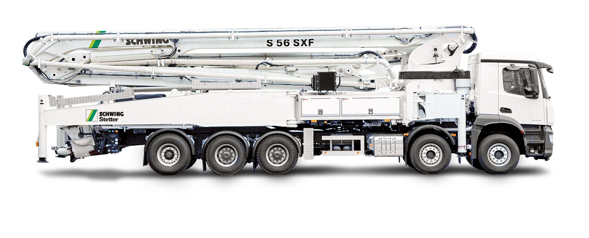 Wo große Fördermengen über lange Zeiträume gepumpt werden müssen, bedarf es hochwertiger und robuster Maschinentechnik. Diese Charakteristik soll auch die neue Autobetonpumpe des deutschen Herstellers Schwing aus Herne charakterisieren. Hohe Pumpleistung bei niedriger Motordrehzahl und die bekannte Robustheit des Rock-Betonventils versprechen niedrige Betriebs- und Wartungskosten bei gleichzeitig langer Lebensdauer. Durch den geringen Platzbedarf beim Abstützen der Autobetonpumpe und eine laut Hersteller besonders kurze Aufstellzeit dürfte die neue S 56 SXF als ein ideales Arbeitsgerät für anspruchsvolle und zeitlich engmaschig getaktete Großbaustellen gelten. Insbesondere da, wo große Betonmengen über lange Zeiträume konstant gepumpt werden müssen, will die S 56 SXF ihre Stärken ausspielen. Die Autobetonpumpe hat eine Reichhöhe von 55,2 m, eine Fördermenge von 162 m³/h und einen maximalen Förderdruck von 85 bar.