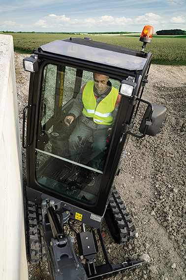 Die neuen Modelle in der 1,5-t-Klasse sind mit zusätzlichem Ein- und Ausstieg rechts ausgestattet – ein Vorteil bei Straßenbaustellen und gut für direkte Kommunikation und Sicht zur rechten Seite hin. Die neue XL-Kabine bietet den Raum und Komfort wie ein 3,5-Tonner. Für den schnellen Einstieg lässt sich die Konsole komplett wegklappen – der Fahrer bleibt beim Einsteigen nicht hängen. Der Fußraum bietet Platz genug – auch für Schuhgröße 48 und größer. Überhaupt lässt sich der Arbeitsplatz individuell auf die Fahrergröße bequem einrichten. Die großzügigen Glasflächen erlauben eine optimale Sicht auf Anbauwerkzeug und Arbeitsumgebung, insbesondere die Kette rechts unten ist gut im Blick.