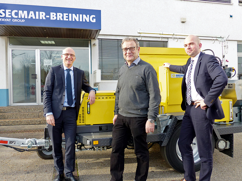 Das deutsche Unternehmen Breining war im Jahr 2001 von der in Bordeaux ansässigen Fayat-Gruppe übernommen worden. Vor drei Jahren wurden die letzten Maschinen in Remshalden gebaut. Nach dem Umzug nach Frankreich ist das Unternehmen als Secmair-Breining am Markt aktiv. »Maschinen für DSK, für Riss- und Fugenverguss oder das Spritzen von Bitumenemulsionen sind noch immer unser Hauptgeschäft. Das gilt auch für den Service und die Vorhaltung von Ersatzteilen«, berichtet Europa-Verkaufsleiter Olivier Brancheriau.