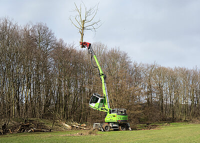 Die dreiteilige Abbruchausrüstung AB23 soll indes den Sicherheitsabstand zum Abbruchobjekt weiter erhöhen. Darüber hinaus mache sie den Einsatz der Maschine noch flexibler, indem größere Reichweiten ermöglicht und Arbeiten über Störkanten hinweg erleichtert werden sollen. Dabei kann die Ausrüstung aufgrund des vollhydraulischen Schnellwechselsystems per Knopfdruck aufgenommen oder abgelegt werden, sodass der schnelle und sichere Wechsel auf eine kürzere Umschlagausrüstung möglich ist. j