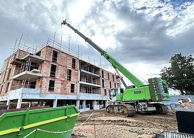 Sowohl die Schalung als auch andere zu hebende Materialien wiegen jeweils zirka 2 t und haben ungleichmäßige Strukturen, die leicht vom Wind erfasst werden können. Diese Umstände können die Hebearbeiten schnell erschweren. Glücklicherweise bietet der robuste 70 t-Teleskopkran hierbei hohe Stabilität, denn das Raupenfahrwerk kann auf eine Gesamtbreite von 4,8 m ausgefahren werden. Zusammen mit dem robust konstruierten Ausleger werden dadurch die Pendelvorgänge stark minimiert.