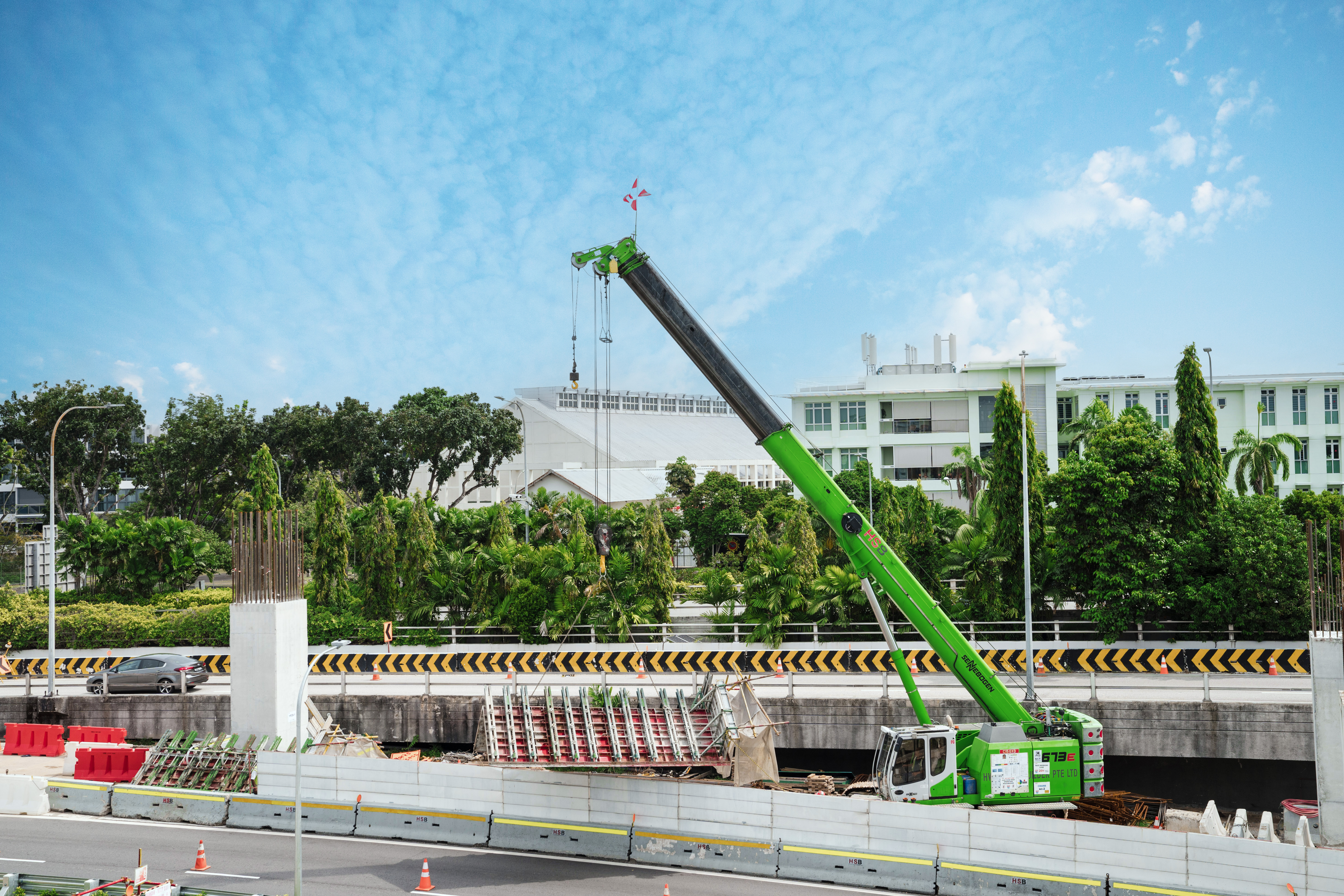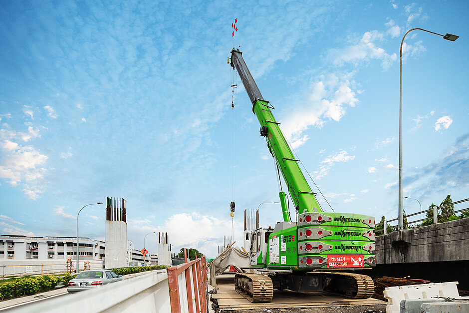 Der Bau des neuen Tampines-Viadukts bringt einige Herausforderungen mit sich. Die Montage muss auf engstem Raum erfolgen, und es gibt nur wenig Platz für die Durchführung der schweren Hebearbeiten. Als Experte auf diesem Gebiet wurde Hwa Seng Builder Pte Ltd (HSB) beauftragt, ein Anbieter von Tiefbau- und Bauleistungen, der einen 70 t-Raupen-Teleskopkran von Sennebogen einsetzt.