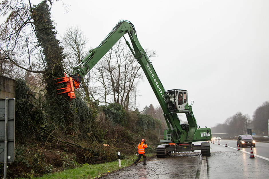 Den Verkehr, der in Richtung Essen an ihnen vorbeirauscht, sind die drei Männer im Fälltrupp gewohnt. Während Torsten Weng den Bagger steuert und die großen vom Efeu umwucherten Bäume sicher ablegt, kümmern sich seine beiden Mitarbeiter Stanislaw Sawada und Grzegorz Jacek darum, dass rund um den Stamm alles freigelegt wird. Stück für Stück werden die bis zu 16 m hohen Bäume dabei kontrolliert abgetragen. Den letzten Schnitt macht dann wieder der Mann an der Motorsäge, weil so nahe am Boden mit Steinen und Unrat der Schneidkopf geschont werden soll. Um den Verkehr nicht zu sehr zu behindern ist dafür nur der Seitenstreifen und die Einfahrt zu Autobahn gesperrt. Der Verkehr kann weiterlaufen, weil die Bäume kontrolliert abgetragen und abgelegt werden.