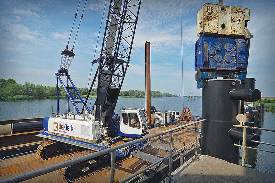 Hierfür kommt ein Sennebogen-Raupenkran des Typs 2200 E zum Einsatz. Seine Aufgaben umfassen die Demontage des vorhandenen Leit- und Pfahlwerks, das Aufstellen von drei neuen Rohrpfählen, die Versetzung und Anpassung eines Pfahls sowie das Anbringen von neuem Leitwerk, komplett mit Landungseinrichtungen. Das Einbringen der Pfähle erfolgt per Aufsatzrüttler, dazu hält der Raupenkran den Vibrator am Haken des 31,7 m langen Gittermastauslegers. Mit dem Aufsatzrüttler werden die Pfähle gehoben sowie gesenkt und dann metertief in den Boden getrieben.