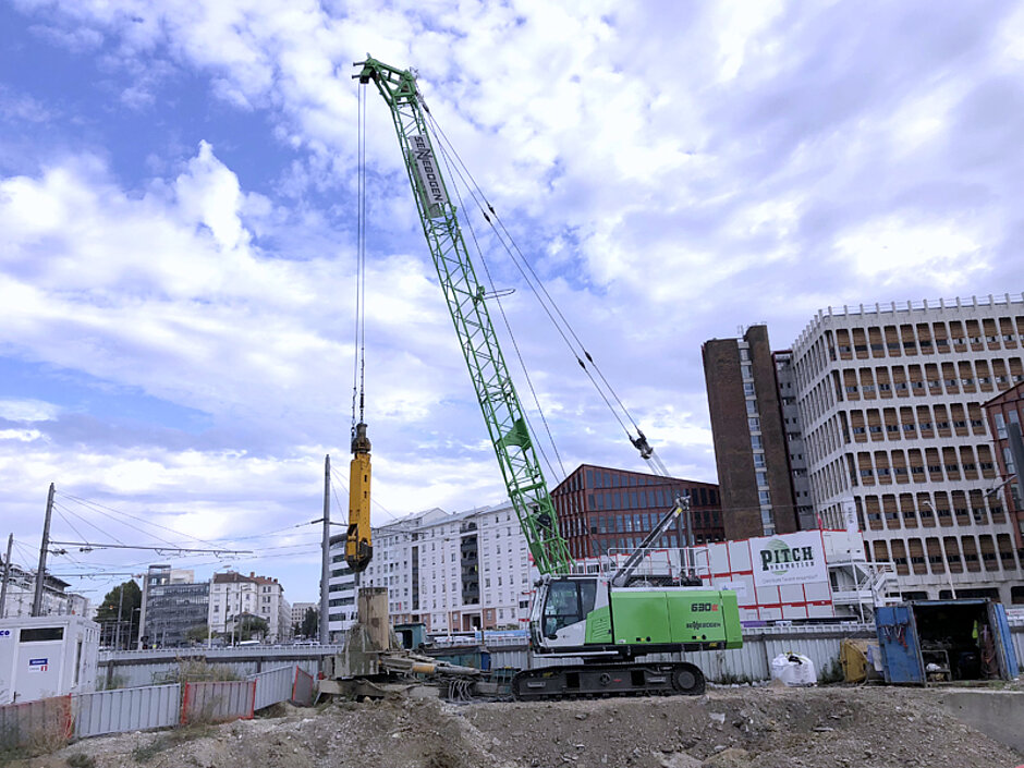 Denn auf dem Gelände im Bezirk Part-Dieu gibt es viele Einschränkungen: Die Maschine muss die unterirdische Infrastruktur der bereits errichteten Anlage umgehen, wobei der öffentliche Nahverkehr der Stadt Lyon mit seinen Straßenbahngleisen und Oberleitungen nur wenige Meter von der Baustelle entfernt ist. Dank des hydraulisch teleskopierbaren Raupenunterwagens steht der SENNEBOGEN 630 R-HD nicht nur zuverlässig und sicher, sondern lässt sich darüber hinaus zügig und flexibel auf der Baustelle verfahren.