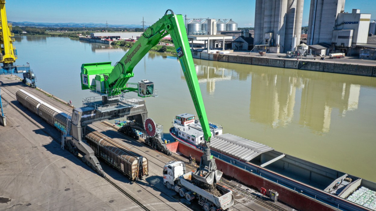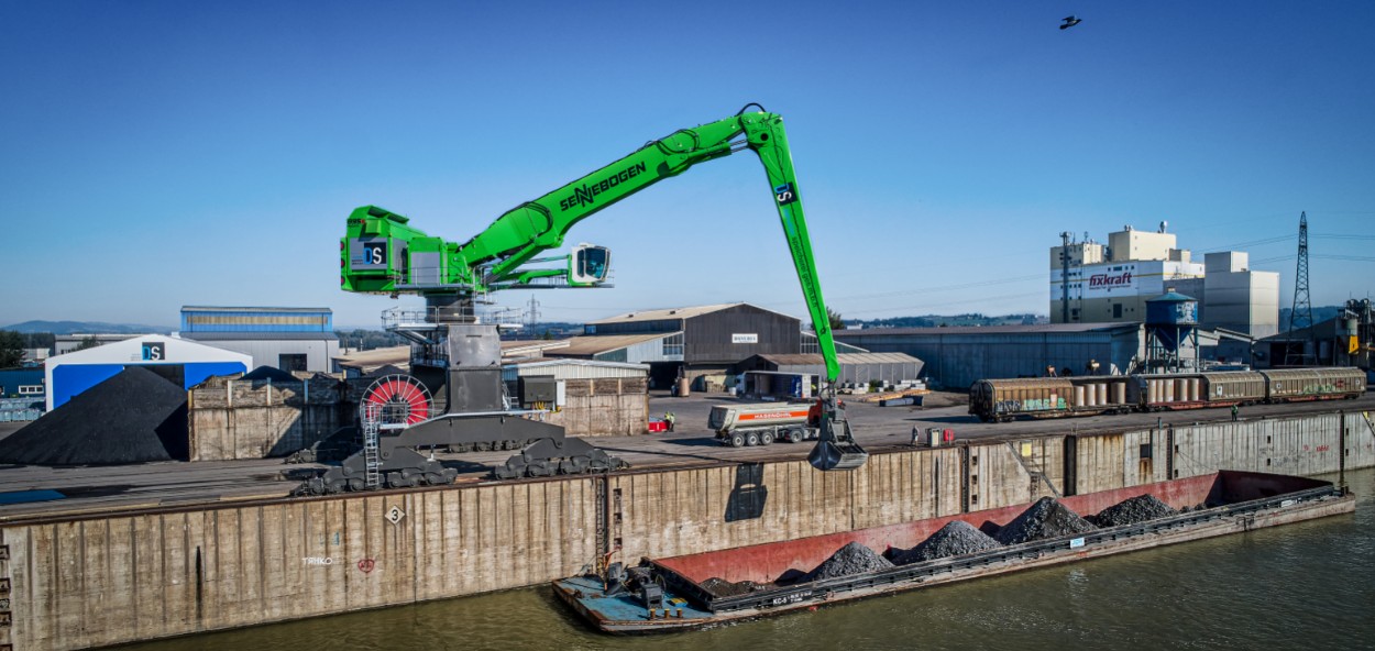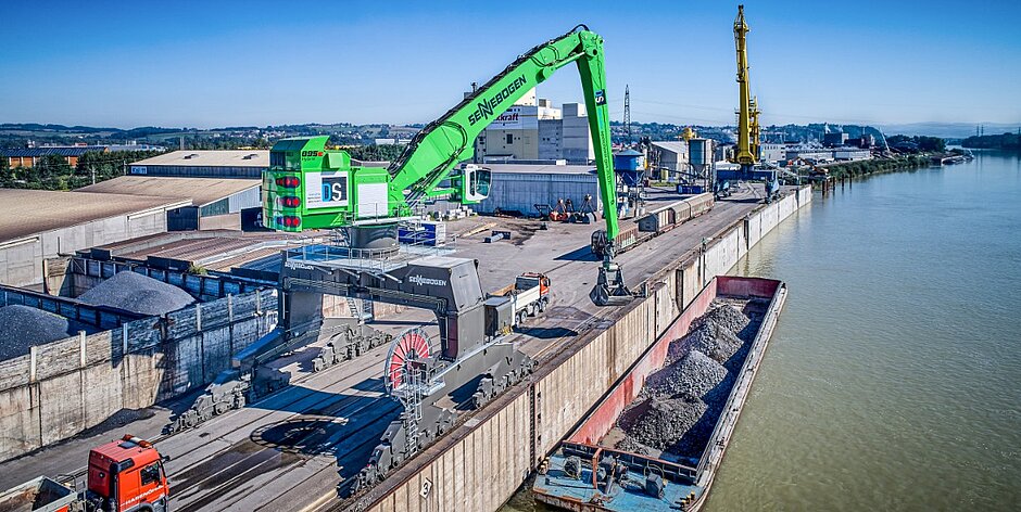 Mit dem 895 E-Serie von SENNEBOGEN hat modernste Umschlagtechnik bei der Danubia Speicherei Ges.m.b.H Einzug gehalten: „Wir waren auf der Suche nach der perfekten Lösung für unseren Betrieb, und zwar ohne Kompromisse eingehen zu müssen. Auf der bauma 2019 ist die Entscheidung dann gefallen“, erläutert Georg Dobesberger, Geschäftsführer der Danubia Speicherei, zur zeitlichen Einordnung des Projektes. Die bisherige Lösung mit zwei seilbetriebenen Hafenkranen war zu diesem Zeitpunkt bereits in die Jahre gekommen, die Ersatzteilversorgung aufgrund des Alters immer aufwändiger und das Umschlagvolumen an ihrem Kai ist kontinuierlich gestiegen. Mittlerweile wird jährlich ein Volumen von rund 950.000 Tonnen Material aller Art, von Getreide, über Düngemittel bis hin zu Salz und Stückgütern, am Kai des Unternehmens bewegt. Das Besondere ist jedoch, dass die Kaimauern, je nach Wasserstand, relativ hoch gelegen sind – und nur der 895 mit seinen gewaltigen Ausmaßen konnte sämtlichen Anforderungen der Danubia Speicherei hinsichtlich Reichweite, Reichtiefe und Geschwindigkeit gerecht werden. Zusammen mit Ascendum Baumaschinen Österreich wurden die Überlegungen konkretisiert: Ein auf die Spurbreite der vorhandenen Schienen angepasstes Schienenportal, 35 m Reichweite, eine um 7 m hoch- und runterfahrbare Hafenkabine, ein durchdachtes Aufstiegskonzept sowie eine Stromversorgung über 300 m Fahrstrecke hinweg.