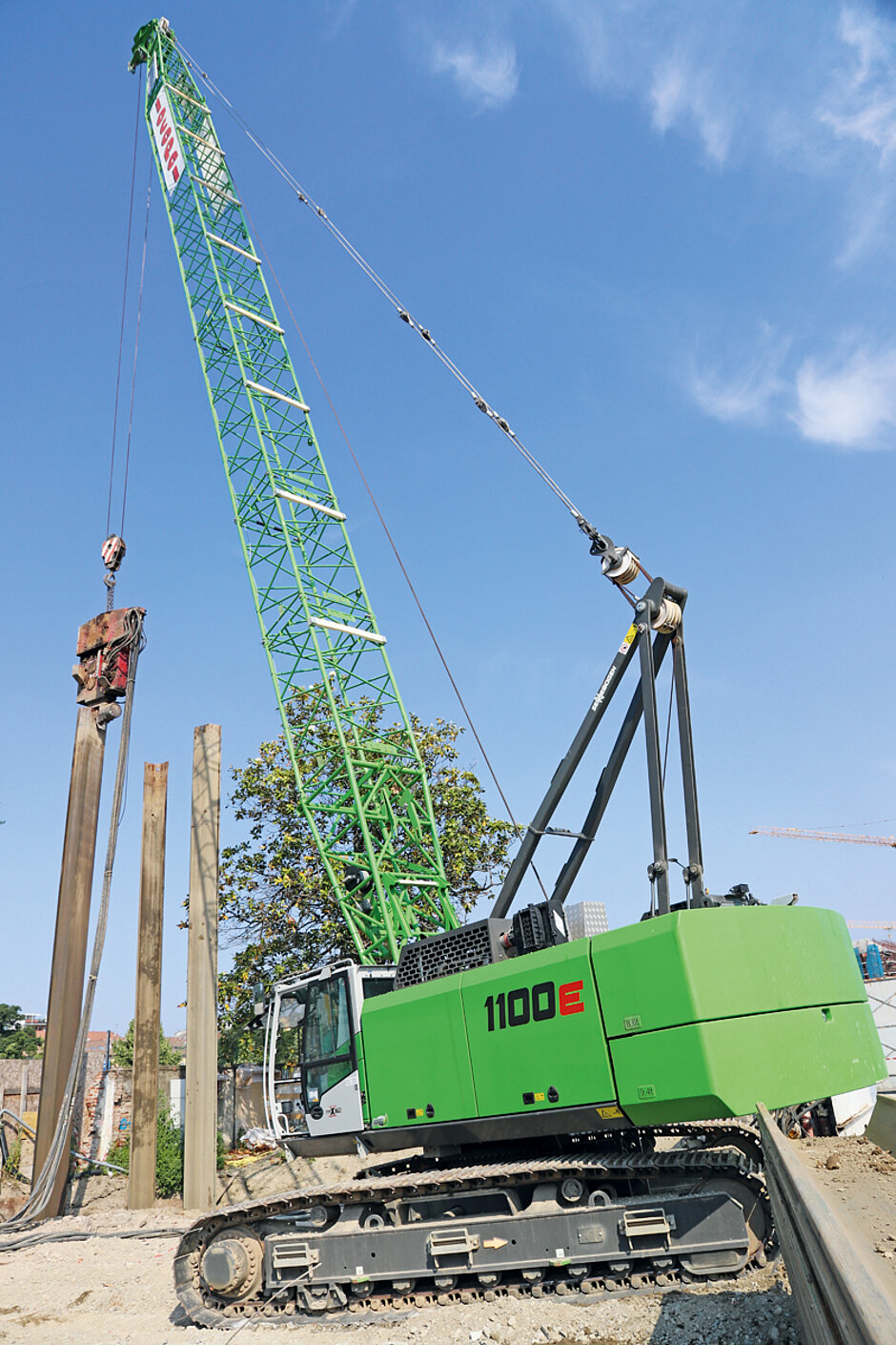 Der 1100 E gehört mit einer Traglast von 50 t zur breiten Palette an Raupenkranen des Straubinger Maschinenherstellers. Ausgerüstet mit einem Aufsatzrüttler zieht er die Spundwandbohlen aus dem Baugrund und legt sie kontrolliert neben sich ab. Das deutsche Unternehmen verfügt über mehr als 60 Jahre Erfahrung beim Bau von Kranen. »Der Raupenkran 1100 E ist Teil unseres Fuhrparks, zu dem ein weiterer Raupenkran und zwei Sennebogen-Teleskopkrane gehören«, so Claudio Pizzamano. Der 1100 E gelte dank seiner Kompaktheit mit einem geringen Einsatzplatzbedarf und einer flexiblen Lenkbarkeit bei den täglichen Arbeiten und bei Einsätzen wie dem in der Via Argelati als sehr effizienter Partner. »Zudem ist der 1100 E dank seines 129 kW starken Motors eine sehr leistungsfähige und effiziente Maschine«, so der Eigentümer.