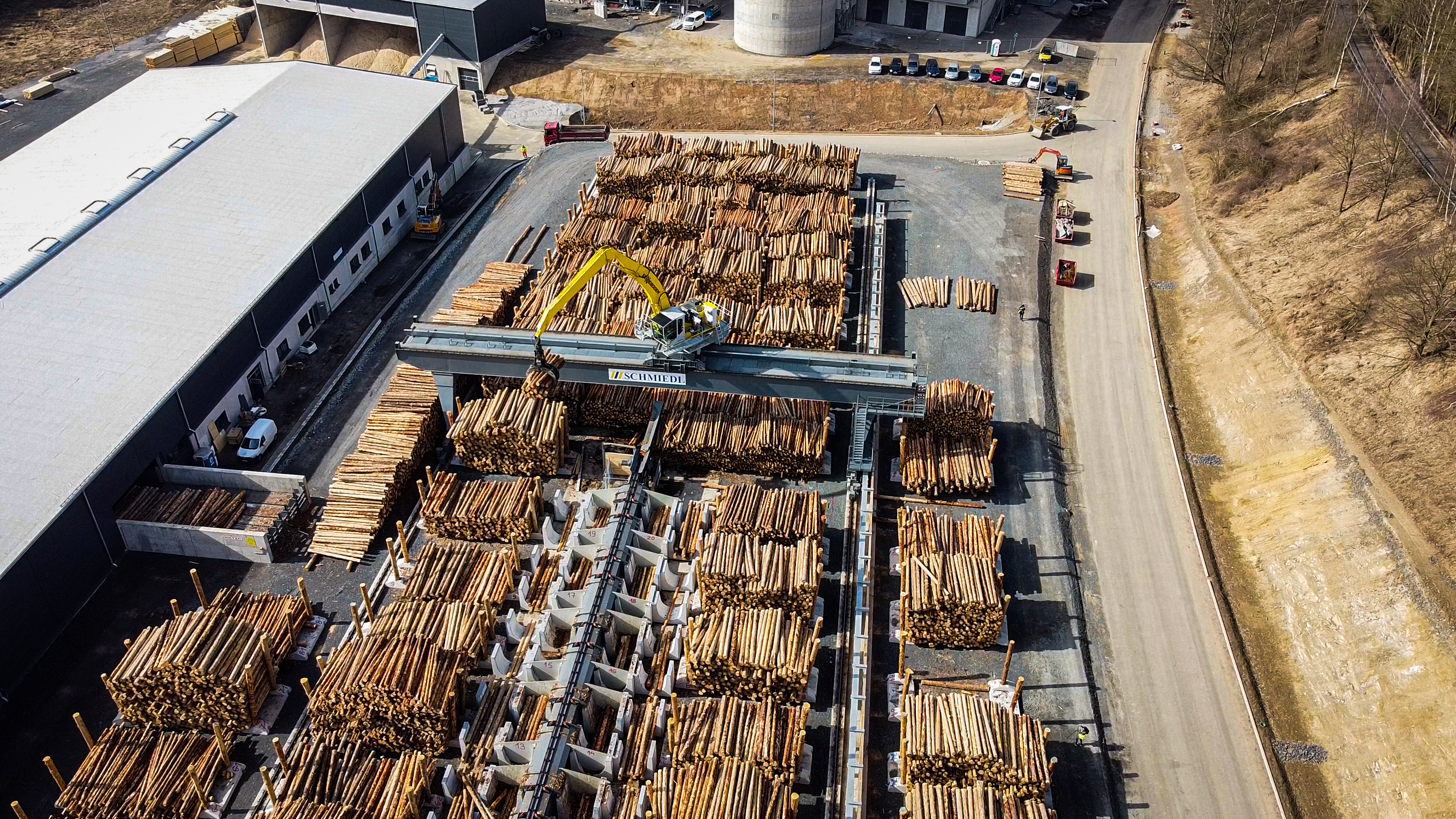 Ende 2020 ging das 50.000 m² große Werk im Energiepark Wunsiedel, pünktlich nach 11 Monaten Bauzeit, in Betrieb. Das erfolgreiche Traditionsunternehmen investierte knapp 40 Millionen Euro in den neuen Standort, an welchem zukünftig 1400 Festmeter pro Tag im Zweischichtbetrieb bearbeitet werden sollen. Begleitet durch den Vertriebs- und Servicepartner IBS Industrie- und Baumaschinen Service GmbH fügt sich nun ein elektrisch betriebener SENNEBOGEN 835 E in einer einzigartigen Portalausführung mit 32 m Spurbreite und einem Fahrweg von 112 m in die Prozesse des neuen Werkes ein. Bei der Entladung der ankommenden LKW und dem Beschicken der Säge kommt zusätzlich ein Umschlagbagger 730 E mit Allrad-Antrieb und 168 kW Motor der Abgasstufe V zum Einsatz.