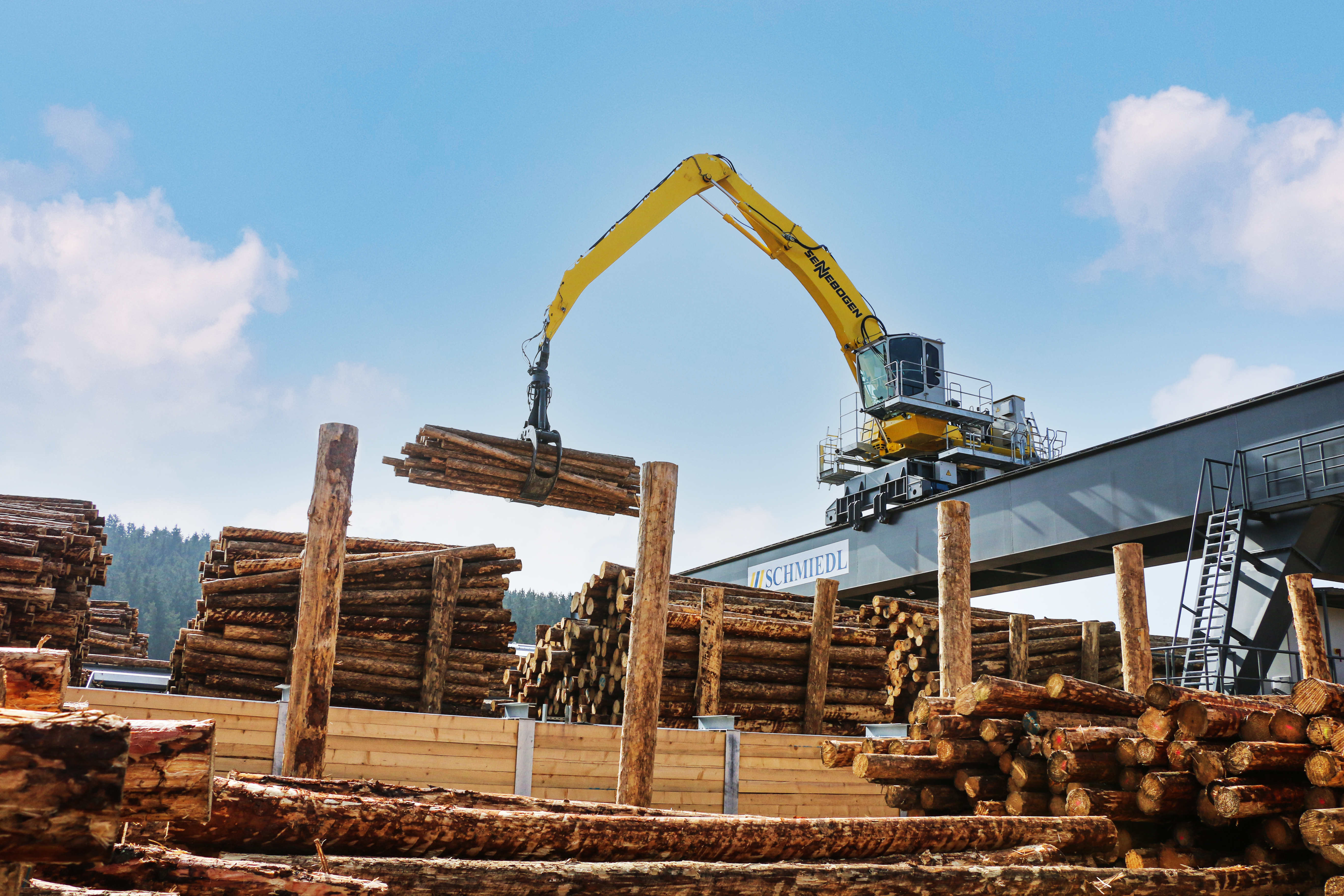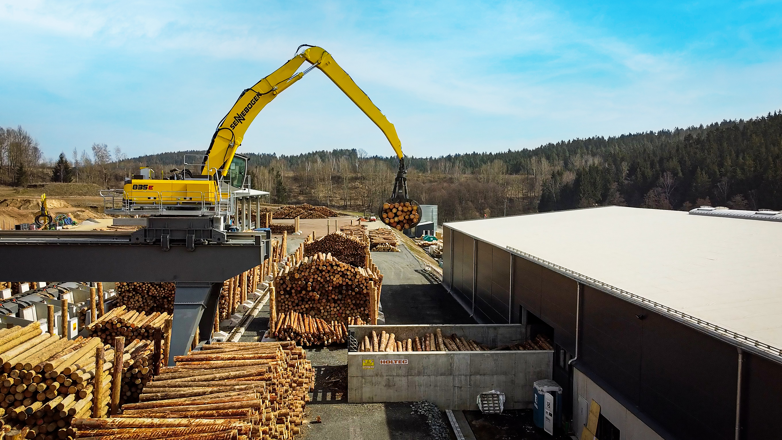 Für das Umschichten der Rundhölzer aus den Sortierboxen zu den Poltern und das Beschicken der Säge wird ein SENNEBOGEN Umschlagbagger mit einem 200 kW starken Elektromotor eingesetzt, der einen umweltschonenden Holzumschlag durch den Wegfall von Abgasemissionen ermöglicht. Ein weiterer Vorteil des Elektrobetriebes liegt auf der Hand, denn im Vergleich zu Dieselmaschinen können enorme Einsparungen in den Betriebs- und Servicekosten durch längere Serviceintervalle erzielt werden.
