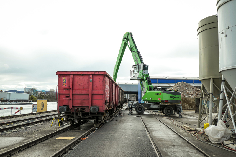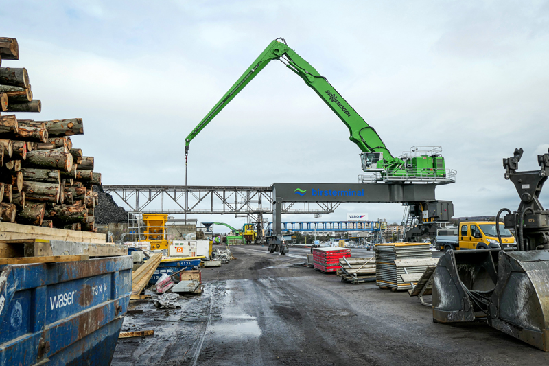 Um dieses große Spektrum an logistischen Herausforderungen mit der entsprechenden Ausrüstung zu meistern, haben die Schweizer vor Kurzem in drei SENNEBOGEN Umschlagbagger investiert: Ein wendiger SENNEBOGEN 835 E mit 18 m-Ausrüstung und 231 kW Dieselmotor arbeitet, je nach anfallender Aufgabe, auf dem gesamten Betriebsgelände und brilliert vor allem bei der Be- und Entladung von Waggons durch die stabile, hochfahrbare Kabine. So genießt der Bediener die perfekte Sicht auf seinen Ladebereich und positioniert Material sorgfältig und sicher. Da auch der Holzbereich bei Birsterminal immer mehr angewachsen ist, wurde die zweite Umschlagmaschine, ein mobiler SENNEBOGEN 855 E Hybrid, mit einem Schnellwechsler versehen: Ob mit Holzgreifer, Zweischalengreifer oder Mehrschalengreifer, auch die Lösung mit dem zweiten mobilen Umschlagbagger führte zu einem Zugewinn an Flexibilität für Birsterminal.