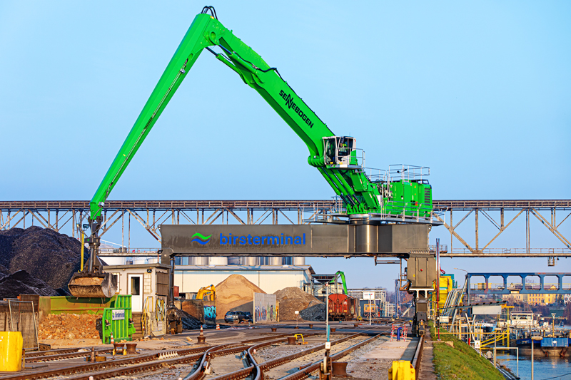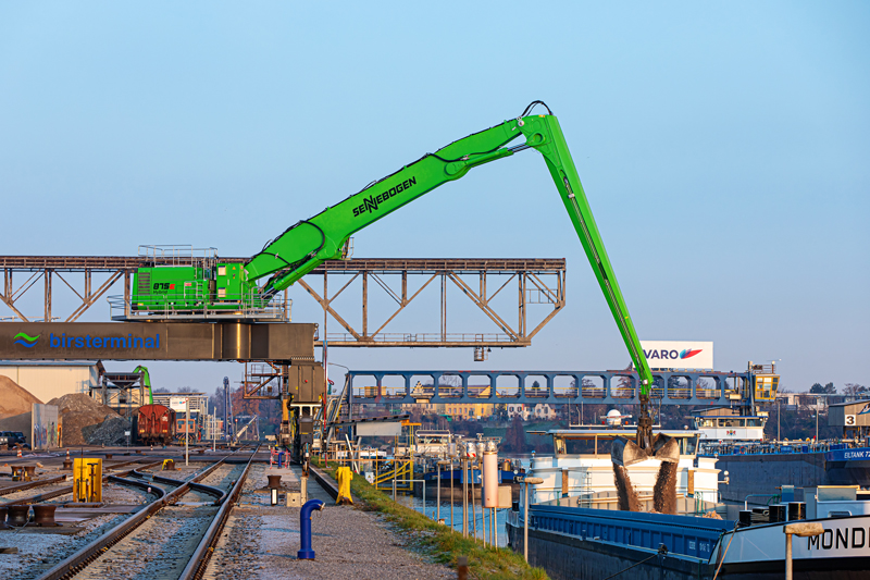 Im Hafen von Basel profitiert die Birsterminal AG als Logistikunternehmen von der perfekten Lage im Dreiländereck Schweiz-Frankreich-Deutschland. Über den Wasserweg erreichen unterschiedliche Materialien das Betriebsgelände der Umschlag- und Lagerprofis am Rheinufer. Seit Ende 2019 unterstützen drei SENNEBOGEN Umschlagmaschinen das Unternehmen. Hauptakteur, der das Umschlaggut sicher und effizient vom Wasser auf Schiene oder Lagerplätze und umgekehrt bringt, ist nun der neue Umschlagbagger SENNEBOGEN 875 E Hybrid: installiert auf einem Schienenportal mit 16 m Spurbreite über drei Schienenstränge hinweg, mit 29 m Hafenausrüstung für den Schwerlastbetrieb sowie 390 kW Elektromotor.