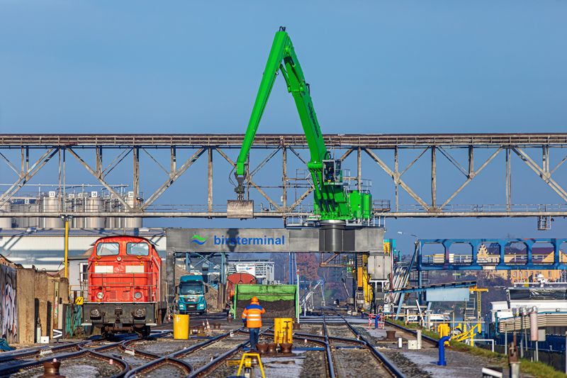 SENNEBOGEN 875 E Hybrid mit Schienenportal der Extraklasse – Hafenumschlag bei der Birsterminal AG in Basel