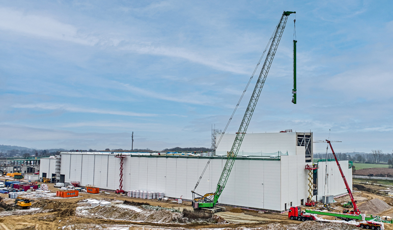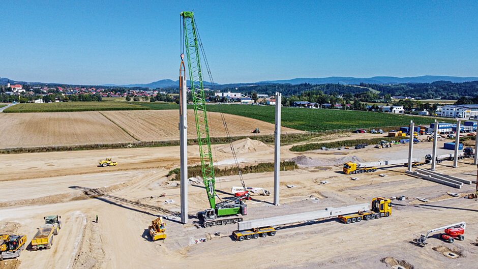 Das Schwergewicht, das für Hebearbeiten bis 180 t – in verstärkter Variante gar bis 200 t – eingesetzt werden kann, hebt bereits zu Beginn des Hallenbaus die massiven Stahlbetonstützen und die dazugehörigen -binder in Position und fungiert dabei als Pick & Carry-Maschine. Dies ist möglich, weil alle Sennebogen-Raupenkrane dank der kräftigen Fahrwerke auch mit bis zu 90 % der maximalen Traglast am Haken immer noch auf der Baustelle verfahren können. Dies ist eine Eigenschaft, die ebenso der Max-Bögl-Bauleiter Hochbau, Matthias Prade, der auch vor diesem Projekt oft mit Sennebogen-Raupenkranen gearbeitet hatte, sehr an der Maschine schätzt: »Dass der Raupenkran mit der Last verfahren kann, ist auf solchen Großbaustellen ein klarer Vorteil, vor allem gegenüber Autokranen.«