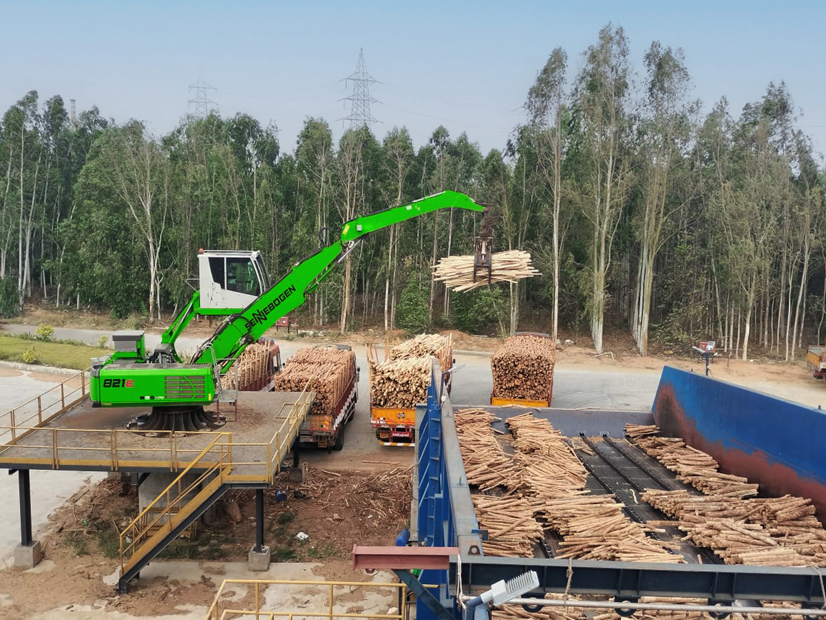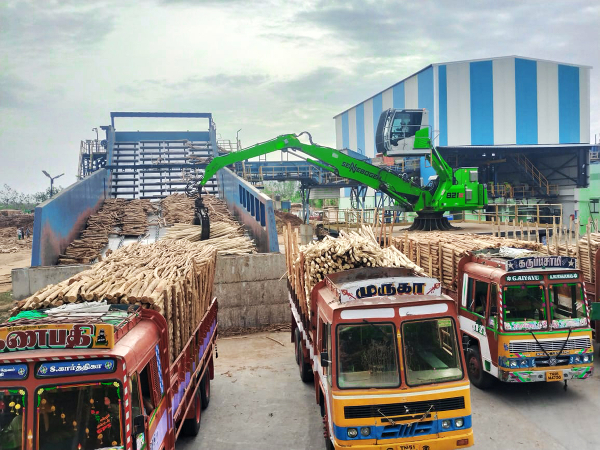 Neben der Bagasse als Hauptbestandteil ist auch Holz ein wichtiger Rohstoff für die Papierproduktion von TNPL. Zum Entladen der per LKW angelieferten Holzstämme setzt das Unternehmen auf vier stationäre und elektrisch betriebene Sennebogen 821 E Umschlagmaschinen, die von dem lokalen Service- und Vertriebspartner Forsenia Engineering Pvt Ltd. in Betrieb genommen wurden. Mit einer Reichweite von jeweils 11 m und einem 0,7 m² fassenden Holzgreifer verladen die auf Betonplatten befestigten Maschinen das Holz auf ein Metallplattenband, über welches der Rohstoff einem Häcksler zugeführt wird. Dabei ist ein hohes Maß an Geschwindigkeit und Effizienz gefragt, da das Unternehmen bei der Abfertigung der LKW und der Beschickung des Schredders unter hohem Zeitdruck steht. Die Maschinen sind mindestens 16 Stunden am Tag im Einsatz und trotzen dabei den herausfordernden Witterungsbedingungen. Bei Temperaturen von 37 bis 40 Grad und einer Luftfeuchtigkeit von bis zu 57 Prozent verladen sie täglich 500 - 950 t Rundholz und ermöglichen so einen kontinuierlichen Betrieb der Anlage ohne kostspielige Stillstände in der Produktion.