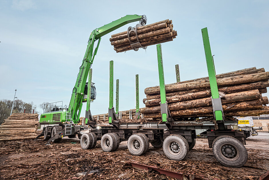 Rundholz-Logistik mit dem SENNEBOGEN Umschlagbagger 835 E und Anhänger