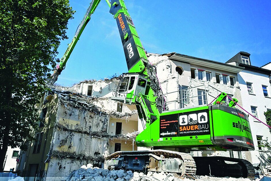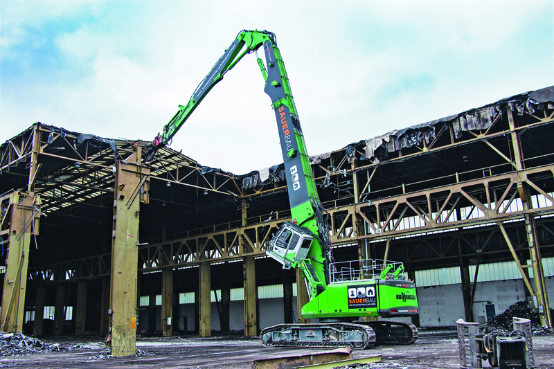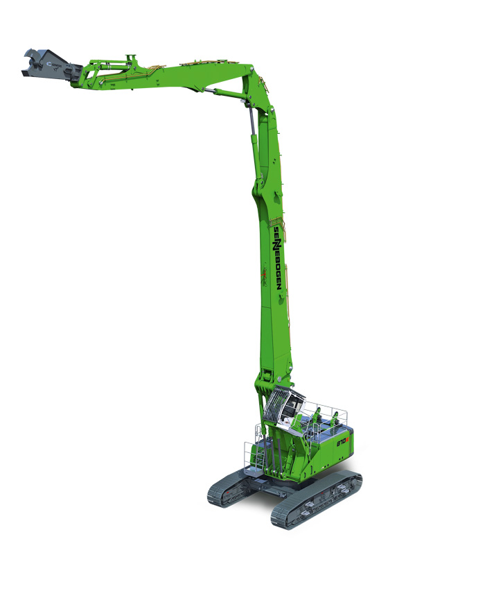 Die neue, lange Arbeitsausrüstung setzt sich aus einem 19,5 m langen Grundausleger mit Schnellwechseleinrichtung und einem 2,5-m-Zwischenausleger sowie dem 12,5-m-Stiel mit Umlenkmechanismus zusammen. Insgesamt bringt es die Ausrüstung somit auf eine Reichhöhe von 36 m und eine Reichweite bis 20 m. Über den gesamten Arbeitsbereich verfügt der Abbruchbagger über komfortable Traglasten bis 4 t. Weiterhin ist die 33-m-Ausrüstung verfügbar. Ein Augenmerk lag bei der Konstruktion der Maschine auf einer besonders hohen Standsicherheit und einer robusten Ausführung aller Komponenten. Die Maschine basiert auf der Grundmaschine des 870 E mit einem 261 kW starken Dieselmotor: Zwei Spurweiten mit 4,2 m und 2,6 m sind dank des teleskopierbaren Raupenunterwagens einstellbar. Für den Transport der 115 t schweren Maschine können die Ausrüstung und der Heckballast abgenommen werden. Damit reduziert sich das Transportgewicht auf 66 t. §