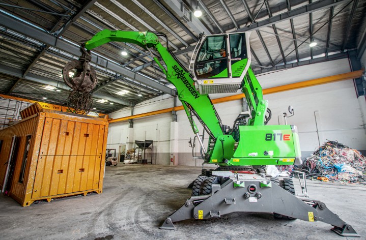 Mit 1,3 Tonnen Traglast bei 9 m Reichweite kann der SENNEBOGEN 817 E die Granulieranlage beschicken, ohne zu verfahren. Das spart Zeit und senkt die Betriebskosten.