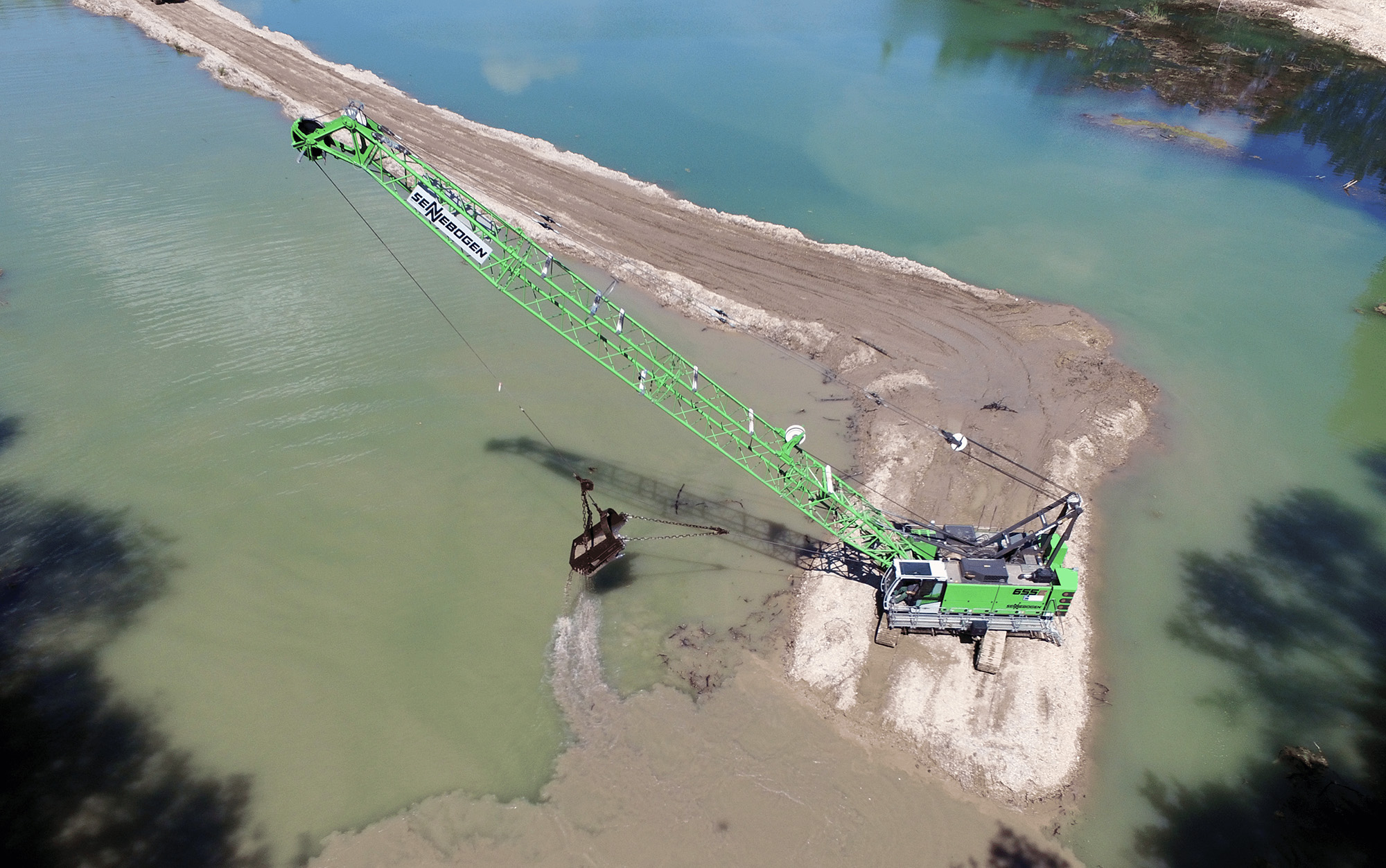 Mit dem Erwerb eines alten Kies-Sees bei Bentfeld verfolgt das nordrhein-westfälische Bauunternehmen Schlotmann verschiedene Ziele: Zunächst soll das Gebiet für die Kiesgewinnung genutzt und anschließend als naturgerechte Kulturlandschaft rekultiviert werden. Für eine effiziente und naturbelassene Nachkiesung entschied sich die Firma bei diesem anspruchsvollen Projekt für einen Seilbagger der Marke Sennebogen.