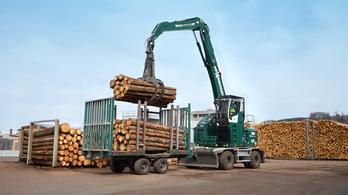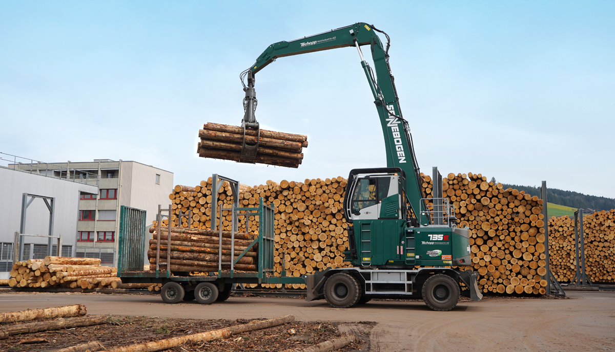 Die Tschopp AG bezieht ihr Holz regional aus einem Umkreis von 100 km. Der Transport wird durch das Unternehmen selbst organisiert und größtenteils mit werkseigenen Lkws durchgeführt, um eine nahtlose Weiterverarbeitung im Werk zu gewährleisten. Auch in der Produktion setzt man auf Nachhaltigkeit: Ein eigenes Holzwerk versorgt den Standort mit grüner Energie durch die 100-prozentige Verwertung des Rohstoffes Holz. Auch beim innerbetrieblichen Rundholztransport suchte man daher nach einer nachhaltigen Lösung und entschied sich für den 735 E mit elektrischem Fahrantrieb. „Wir identifizieren uns mit den Werten der Firma Sennebogen und setzen ebenso auf zukunftsweisende Technologien, die einen positiven Beitrag für unsere Umwelt leisten.“, so Erich Helfenstein.