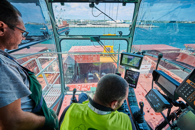 Besonders hervorzuheben ist die Höhenverstellung der Kabine. In einer Sichthöhe von 21,2 Metern hat der Bediener aus seiner komfortablen und geräumigen Portcab-Kabine eine hervorragende Panoramasicht über den gesamten Arbeitsbereich. Darüber hinaus kann die höhenverstellbare Kabine über den Ladebereich des Schiffes schwenken, sodass der Bediener selbst in den Laderaum blickt, ohne sich ausschließlich auf Kameras verlassen zu müssen. Die zusätzlich installierten Kameras bieten dem Fahrer noch mehr Sicherheit, wenn präzise Verladearbeiten im Schiffsrumpf anstehen. Den in neun Metern Höhe befindlichen Einstieg in die Kabine erreicht der Bediener bequem über ein sicheres System aus wenigen Treppen.