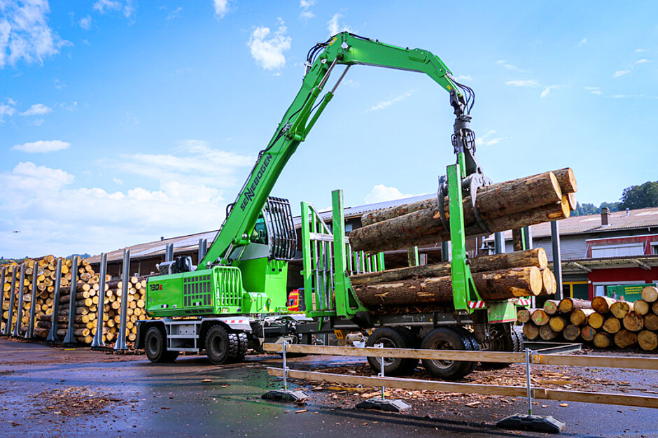 Im Zuge der anstehenden Neugestaltung des Rundholzplatzes am Standort Worb wurden die Transportwege im Sägewerk analysiert. Ein neues Konzept, bestehend aus der Umschlagmaschine 730 E-Serie von SENNEBOGEN und einer geländegängigen Anhänger-Applikation, erwies sich dem früheren Platzkonzept mit Portalkran als überlegen. Heute übernimmt die Holzfahrmaschine das Verheben der Rundhölzer. Aber nicht nur das, denn der 730 E-Serie mit Anhänger hat viele Zuständigkeiten und ist permanent im Einsatz: Er transportiert täglich viele Tonnen Holz vom Rundholzplatz bis zum Sortierstrang, stapelt Holzstämme auf, belädt den Anhänger und beschickt die Säge.