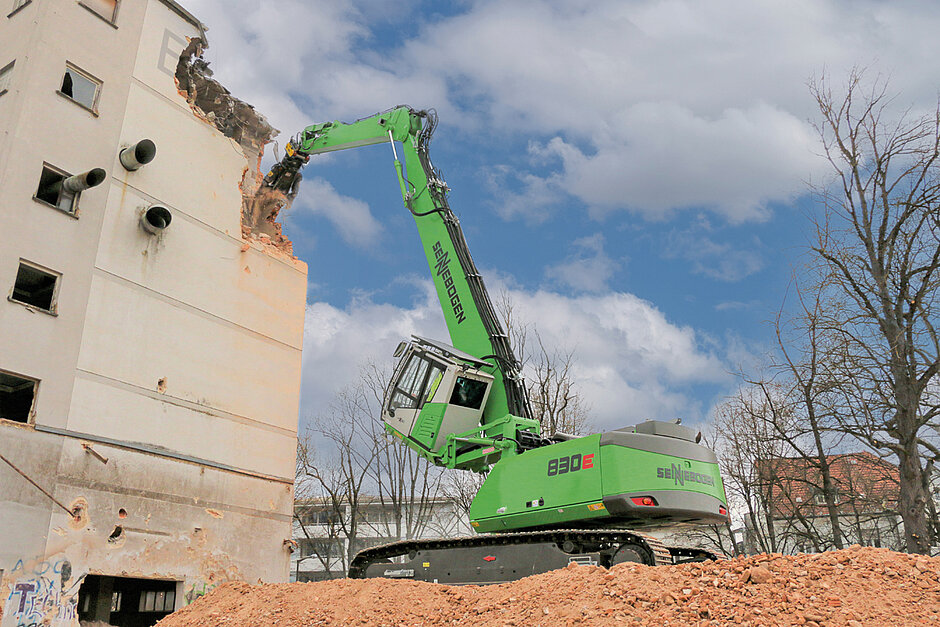 Der Abbruchbagger 830 E gilt als zuverlässiger Sennebogen-Partner, der einen Gebäuderückbau schnell und effizient durchführen kann, in diesem Fall binnen zwei Tagen. Die vor Ort eigengesetzte Abbruchmaschine, eine Mietparkmaschine der Sennebogen-Vertriebsgesellschaft, war mit einem vollhydraulischen Schnellwechselsystem und einer Abbruchzange ausgerüstet.