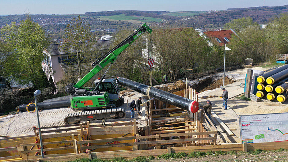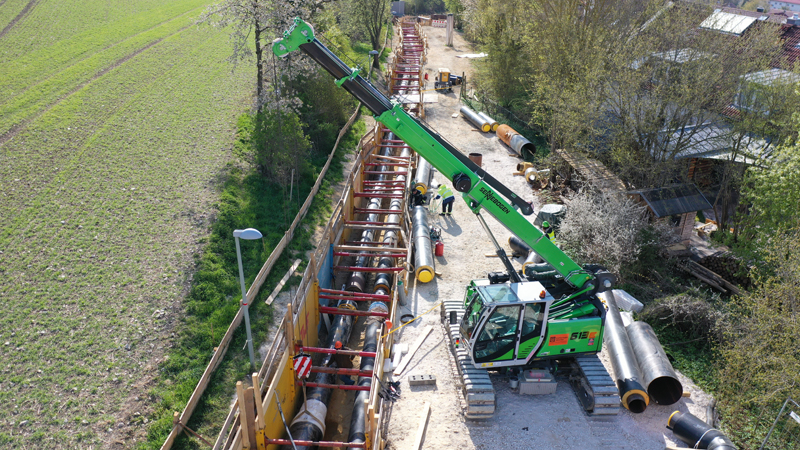 Mit einem Anteil von mehr als 60 % an regenerativen Brennstoffen schreibt die FUG in Ulm Sauberkeit und Nachhaltigkeit über Generationen bei der Bereitstellung von Wärmeenergie groß. Um eine Garantie vor Ausfällen bieten zu können, entsteht im Netz eine zusätzliche »Uni-Leitung«, die u. a. die Technische Universität und das Universitätsklinikum auf dem Ulmer Eselsberg mit Wärme beliefert. Für den beauftragten Rohrleitungsbauer Kraftanlagen München bedeutet dies, dass eine 1,2 km lange Fernwärmeleitung, die aus dem innerstädtischen Kraftwerk kommt, bergauf verlegt werden muss, wo sie in die zentrale Wärmeübergabestation mündet. Steile Hänge und enge Platzverhältnisse erschweren den Zugang – für den kompakten 16-t-Raupentelekran von Sennebogen, der auch 20°-Steigungen meistert, bietet der Einsatz eine perfekte Gelegenheit, seine Vorzüge zu zeigen.