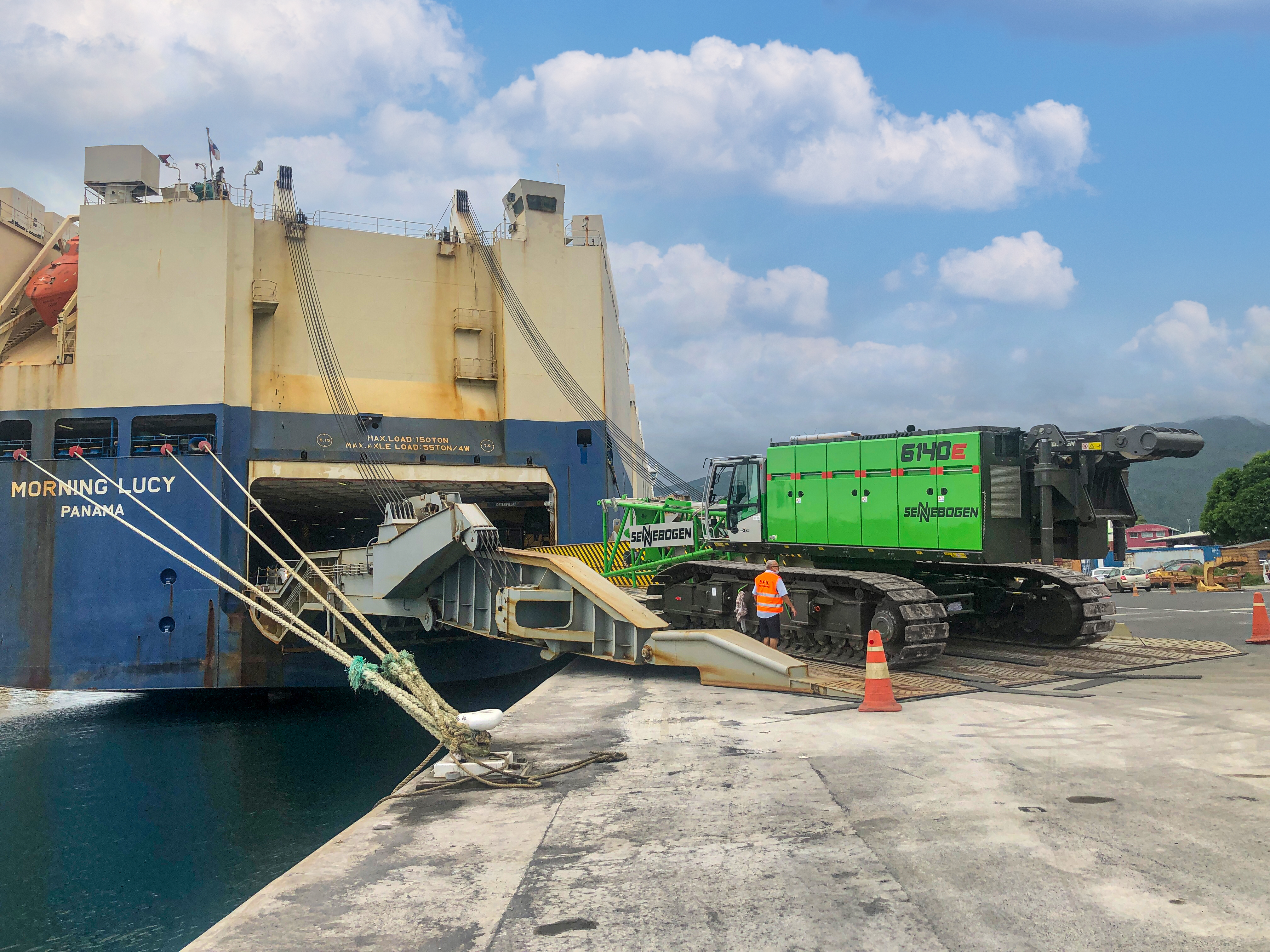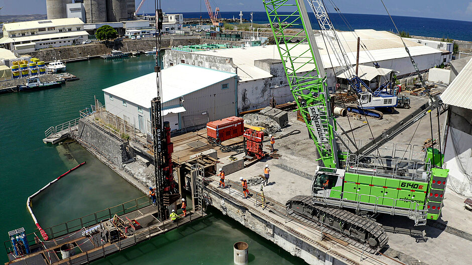 Für ein solches Projekt sind viele unterschiedliche Hebearbeiten erforderlich. Daher war ein besonders vielseitiger und leistungsfähiger Kran von Nöten. ABC Maxilift, einer der Hauptakteure in der Kranbranche auf der Insel, wurde angefragt, eine passende Lösung für die speziellen Anforderungen dieses Projekts zu bieten. "Der anspruchsvollste Punkt an dieser Baustelle ist die weite Entfernung der Rammpfähle vom Ufer. Der Sennebogen 6140 HD Seilbagger mit 35 m Ausleger hebt auch bei 24 m Ausladung noch 17 t, und kann somit auch noch die äußersten Pfähle problemlos in den Boden einbringen", erklärt Nicolas Cheung-Ah-Seung, Betriebsleiter des Krandienstleisters. Die Vielseitigkeit der Maschine sei ebenfalls ein wesentliches Kriterium gewesen. So verrichtet der 6140 HD auf der Baustelle nicht nur alle möglichen Hebe- und Verladetätigkeiten, sondern auch die besonders schweren, dynamischen Arbeiten, für die er ausgelegt ist. Dank seiner Heavy-Duty Konzeption und seinen beiden Winden mit jeweils 350 kN Zugkraft könne er das Einrütteln der Fundamentrohre übernehmen und die schwere Delmag-Ramme steuern. Ausgestattet mit einem Seilgreifer, wird er auf der Baustelle aber ebenso für den Aushub des Materials im Inneren der Bohrrohre eingesetzt. Ein Pluspunkt des Seilbaggers bei dieser Applikation ist, dass die Winden und das programmierbare Tiefenmessgerät automatisch synchronisiert werden. Zudem übernimmt er auch die Verrohrungsarbeiten und glänzt dabei durch den Einsatz seiner Freifallwinden.