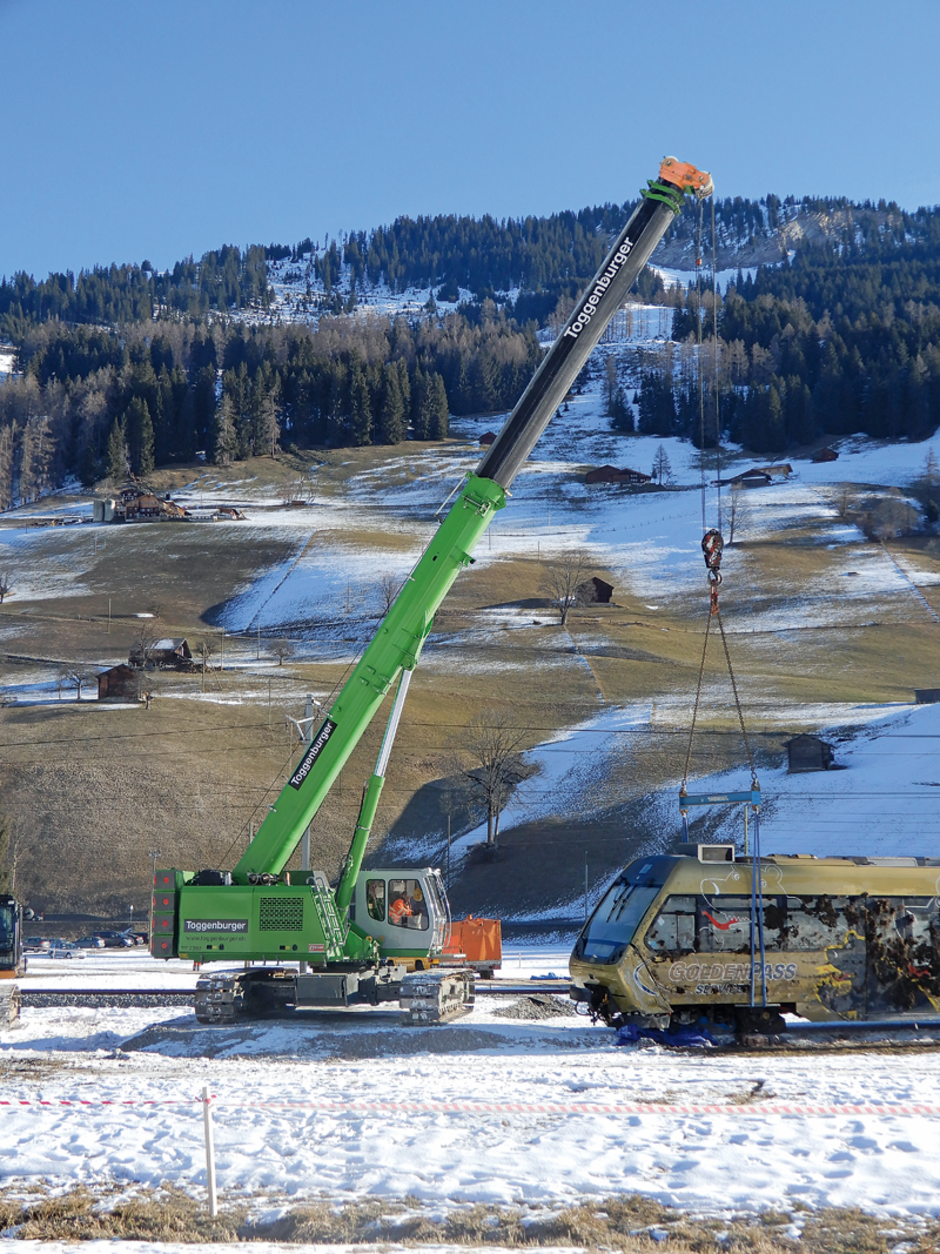 Die Zugkomposition der schweizer MOB hatte am 3. Januar den Bahnhof Lenk in Richtung Zweisimmen verlassen. In Boden/Lenk wurde der 19 t schwere Steuerwagen durch eine Windböe des Sturms Burglind aus den Gleisen gehoben und kam auf der Seite liegend im offenen Gelände zum Stillstand. Nach umfangreichen Vorbereitungsarbeiten konnte der entgleiste Steuerwagen einen Monat nach dem Sturm geborgen werden. Auf dem gefrorenen Terrain postierten sich zwei Raupentelekrane beidseits des auf der Seite liegenden Steuerwagens. Aufeinander abgestimmt hievte der Sennebogen 673 E mit Unterstützung eines zweiten Telekrans den Unglückswagen wieder sicher auf die Schienen. Dieser wurde mit auf sein intaktes Fahrwerk gestellt und dann auf das Gleis gehoben. Dank seiner Spurbreite von 4,1 m und den großen Aufstandsflächen der Raupenfahrwerke konnte die Beeinträchtigung des Untergrunds auf ein Minimum reduziert werden.