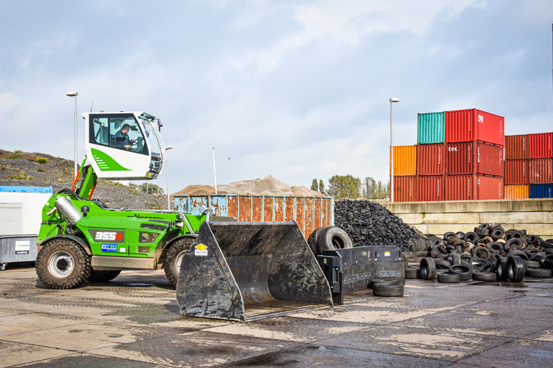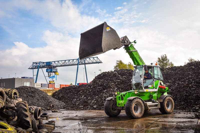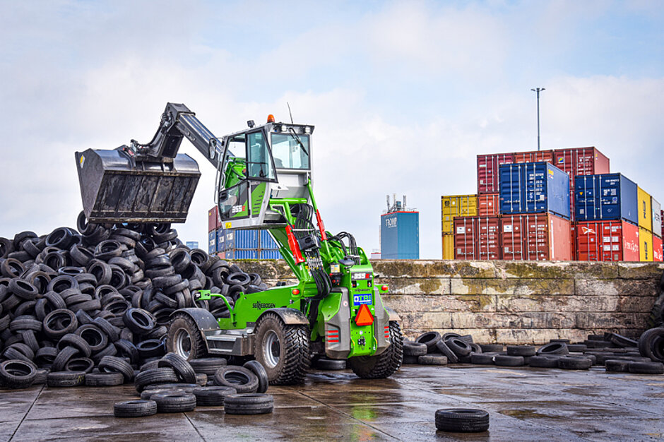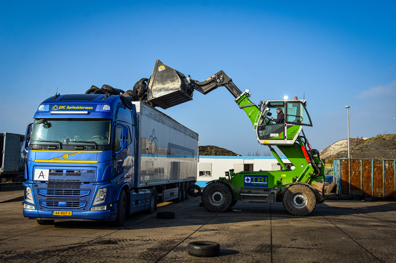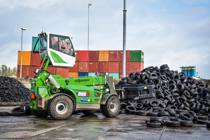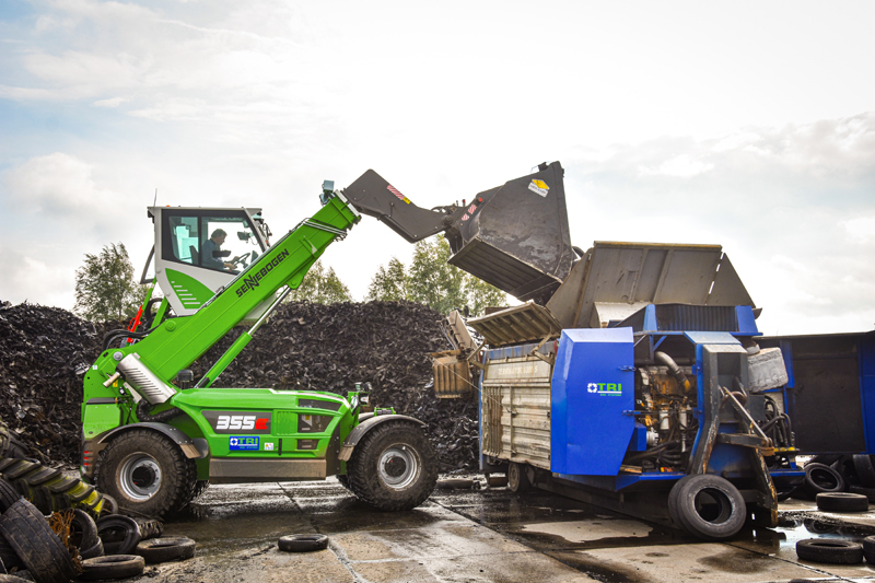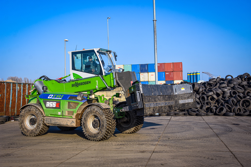 Im Gewerbegebiet Leeuwarden in den Niederlanden verfügt TRI (Total Recycling Industries) über einen Recyclingstandort, an dem jährlich etwa 250.000 Reifen von PKWs und LKWs verarbeitet werden. Hierfür hat das Unternehmen einen eigenen Schredder, mit dem die Reifen (insgesamt ca. 5.000 t) zu Granulat verarbeitet werden. Dieses Granulat dient als Recycling-Brennstoff für Zementproduktionsanlagen. Bei der Verladung der Reifen und Beschickung des Schredders wechselt TRI erstmals von einem Radlader auf einen Teleskoplader SENNEBOGEN 355 E.