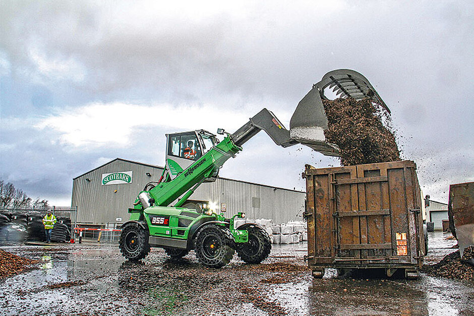 Der 355 E will das Beste aus der Radlader- und Teleskoplader-Technik in einer einzigartigen Maschine vereinen: Er zeigt sich stark sowie robust wie ein Radlader und gleichzeitig stabil und standsicher wie ein Teleskoplader. Die aus Radladern bekannte Z-Kinematik ermöglicht hohe Losbrechkräfte und eine nach Anbieterangaben mühelose Aufnahme des Materials mit der Schaufel aus dem großen Rindenmuldenberg auf dem Gelände der Firma Scotbark.