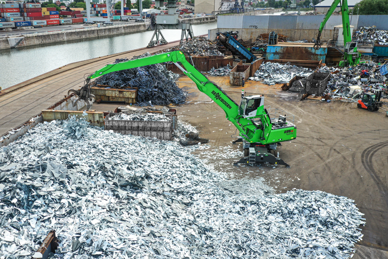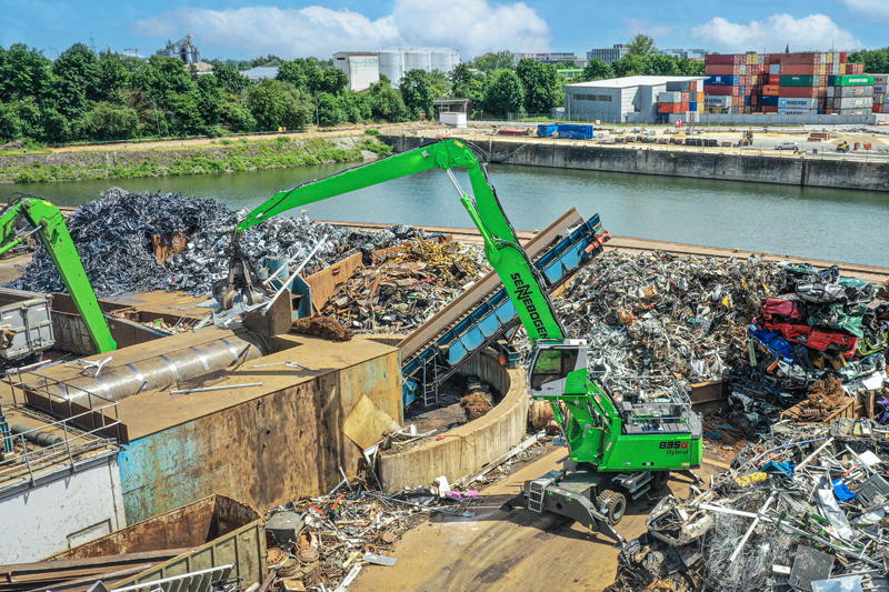 Schüttgutumschlag im Hafen, Schrott- und Schlackeumschlag: Testberichte des neuen Umschlagbaggers SENNEBOGEN 835 G Hybrid