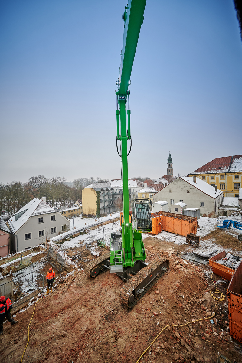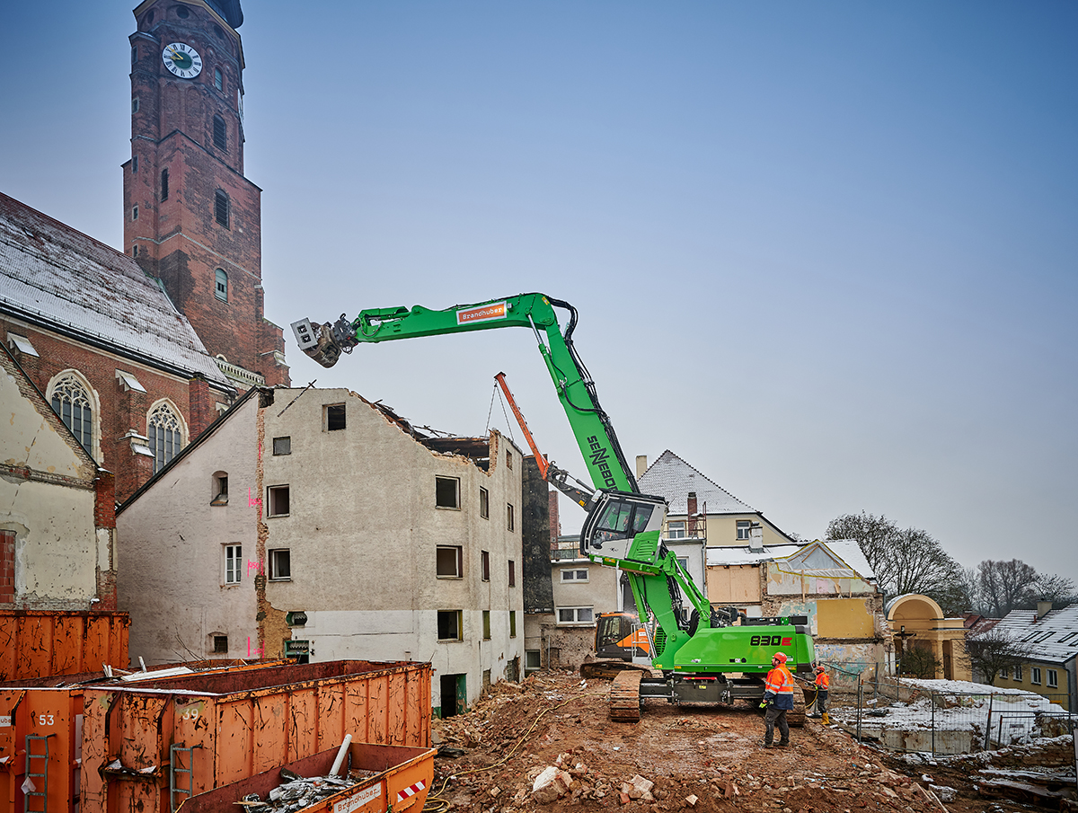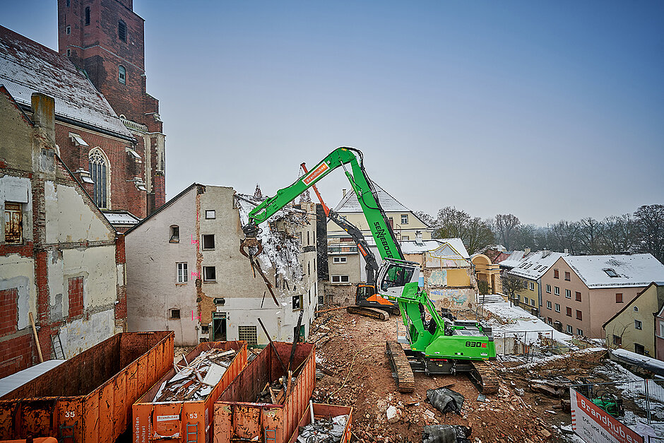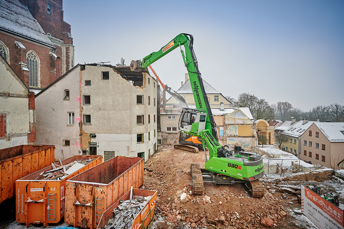Es war vermutlich einer der kürzesten Maschinentransporte in der gesamten SENNEBOGEN Firmengeschichte: Nur rund zwei Kilometer entfernt vom Stammwerk des Maschinenbauunternehmens startete Manfred Brandhuber, Geschäftsführer der Brandhuber Transporte GmbH, vergangenen Dezember ein größeres Rückbauvorhaben im historischen Stadtkern der Straubinger Herzogstadt. Auf dem 2.000 qm großen Areal wurden über 4 Wochen hinweg drei Gebäude selektiv zurückgebaut – die perfekten Gegebenheiten für den SENNEBOGEN 830 E mit 168 kW Motorleistung, sein volles Potenzial als multifunktionaler Abbruchbagger zu entfalten: Standsicheres Arbeiten im 360° Modus, müheloses Entkernen der bis zu vierstöckigen, ehemaligen Wohnhäuser und die umgehende Sortierung des Bauschutts in die vorgesehenen Container.