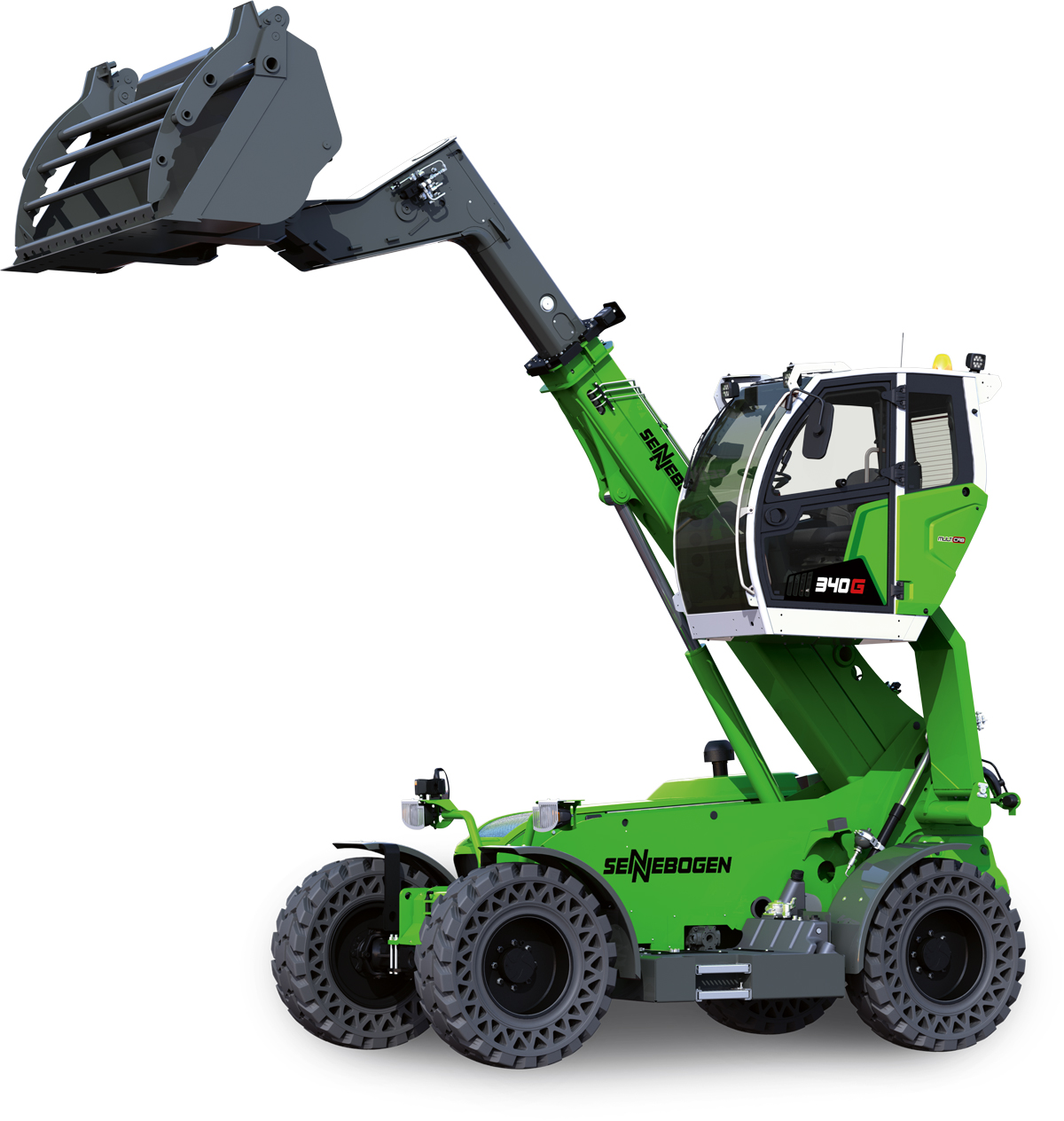 Als weiteres Exponat präsentiert Sennebogen den 4-t Teleskoplader 340 G-Serie, der kompakte Abmessungen mit hoher Leistung und Reichweite vereint. Mit Anbaugeräten wie dem Lichtraumprofilschneidegerät oder einem Mulcher erweise sich die Maschine als echtes Multitalent. Die Multicab-Kabine lässt sich stufenlos auf eine Augenhöhe von 4,10 m hochfahren und bietet eine 360-Grad. Diese Features gewährleisten maximale Sicherheit beim Verladen von Material als auch beim Manövrieren.