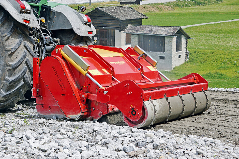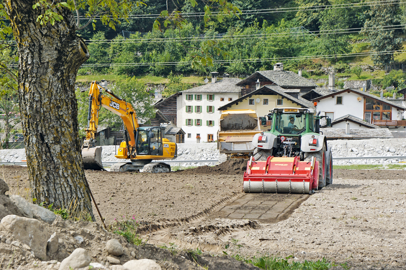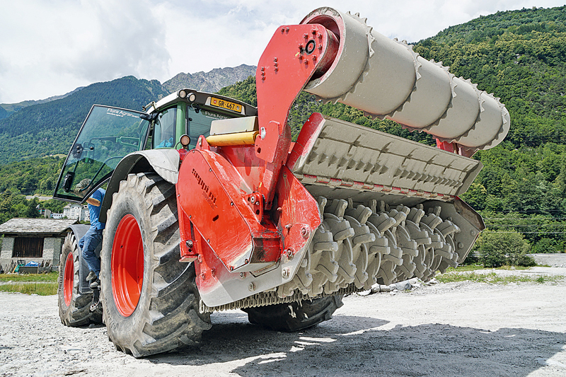 Neben der menschlichen Tragödie hinterließ der Felssturz auch eine tiefe Wunde im Val Bondasca, wo es nicht mehr möglich war, das Land zu bewirtschaften. »Ein Eingriff war notwendig. Es war entscheidend, über qualitativ hochwertige, zuverlässige und technisch hochentwickelte Mittel zu verfügen, um das Material zu beseitigen und den Boden erneut urbar zu machen«, erklärt Joachim Flura, der im Tal mit seinem Fendt-Traktor Typ 936 und einer am Heck angebauten Seppi-Supersoil im Einsatz ist. Seine Aufgabe dabei: eine 4 ha große und mit Steinen bedeckte Fläche rekultivierbar zu machen. Die Supersoil sorgt für einen ausgewogenen Wasserhaushalt und bereitet den Boden darauf vor, eine Humusschicht aufzunehmen, damit Wiesen und Felder wieder wachsen und blühen können.