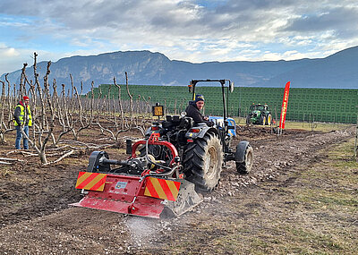 Seppi M. bietet eine Vielzahl an Anbaugeräten an, die mit »2-Fast« schnell und einfach gewechselt werden können. Mit »XTI« steht beispielsweise ein Unterstock-Mulcher für effizientes und präzises Mulchen von Unterholz und Unterstock zur Verfügung. Optional lässt sich der »XTI« mit der Unkrautbürste »XPN« ausstatten. Auch eine Rollhacke (»XRH«) und eine Unterstock-Bürste (»XSP«) stehen zur Verfügung. Das »2-Fast«-System ist mit innovativen Technologien ausgestattet, die sowohl die Effizienz steigern als auch die Kulturen bestmöglich schützen sollen. Der hydraulische Feintaster »Soft Touch« beispielsweise reduziert Schäden an Rebstöcken und Bäumen, indem das Anbaugerät automatisch nach außen gelenkt wird, um Berührungen zu vermeiden. Mit »Float«, der vertikalen Schwimmstellung der Arbeitsmodule, werden Unebenheiten im Gelände automatisch ausgeglichen. Die Anfahrsicherung »Flex-Safe« schützt das Anbaugerät vor Schäden bei unerwarteten Kollisionen mit Hindernissen. Das Modul weicht zurück und kehrt selbstständig in die Ausgangsposition zurück.j