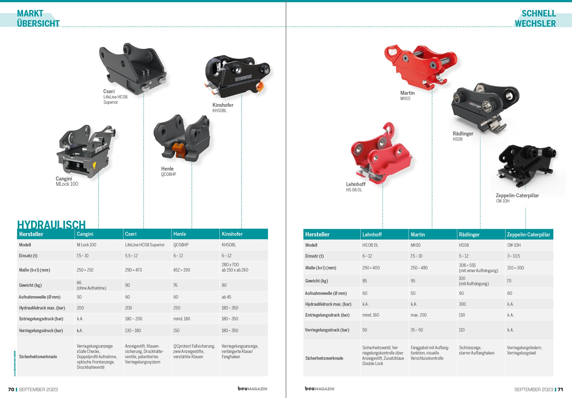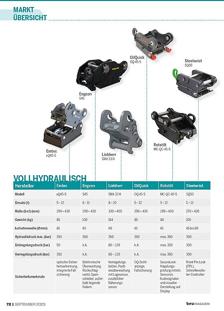 Gezeigt hat sich im Rahmen dieser Ausarbeitung allerdings auch, dass seitens der Hersteller sowohl auf hydraulische als auch vollhydraulische Systeme gesetzt wird: Beide Varianten haben den Vorteil, dass das Aussteigen aus der Kabine beim Ankoppeln von Anbaugeräten nicht erforderlich ist. Der hydraulische Schnellwechsler wird über das Anbaugerät gefahren – in der Fahrerkabine lassen sich dann die Riegelbolzen mittels Knopfdruck automatisch ausfahren. Damit befestigt das hydraulische System das Anbaugerät, schließt es aber nicht an. Dafür ist dann ein vollhydraulischer Schnellwechsler vorgesehen. Zu beachten gilt, dass die Übersicht sowohl hydraulische als auch vollhydraulische Systeme darstellt, diverse Hersteller jedoch beide Varianten anbieten, während andere nur auf ein System setzen.