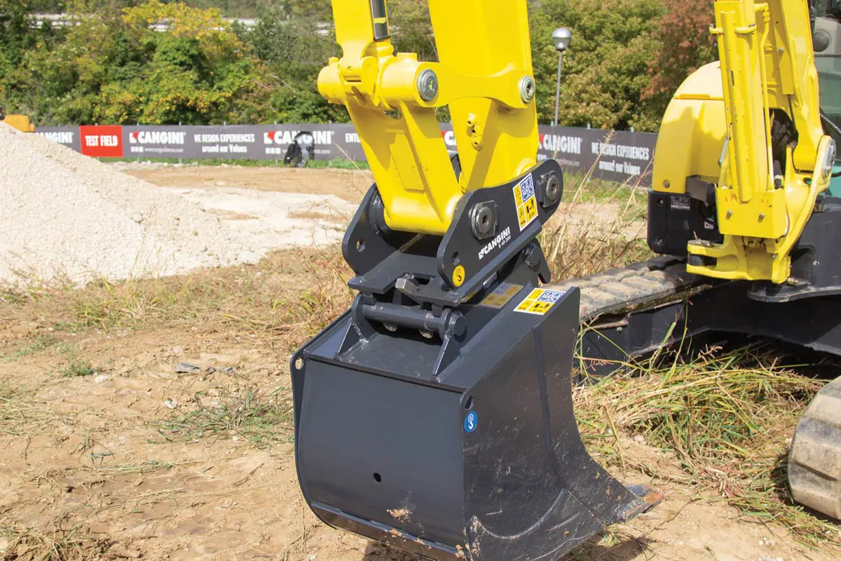 Das hydraulische Schnellwechslersystem M Lock 100 aus dem Hause Cangini mit doppelt wirkendem System soll ein sekundenschnelles An- und Abkuppeln von der Kabine aus ermöglichen. Ohne Aufnahme kommt die Lösung auf ein Gesamtgewicht von 46 kg und ist auf Trägergeräte zwischen 7,5 bis 10 t ausgelegt. Die Seitenwände sind vollständig aus verschleißfestem HB400-Stahl gefertigt. Das aktive Sicherheitssystem verfügt über eine vordere Sicherheitssperre, die aktiviert wird, sobald die Bolzen einrasten und das Anbaugerät sichern, sodass es im Falle eines falschen Eingriffs nicht versehentlich herunterfallen kann.
