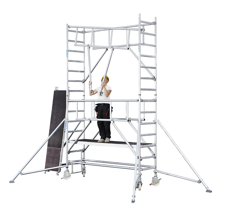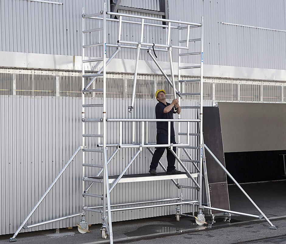Das Geheimnis der ZARGES-Neuheit ist das vorlaufende Geländer sowie der 2-m-Abstand der Plattformen. So kann aus umlaufend gesicherter Position das jeweils nächsthöhere Geländer eingehängt werden, schon bevor die nächste Plattform aufgebaut wird. Dies gewährleistet stets maximale Absturzsicherheit durch ein umlaufendes Geländer. Das vorlaufende Geländer kann durch nur eine Person eingesetzt werden, was neben der besonderen Technik auch der Verwendung von Aluminium als Leichtbaustoff geschuldet ist.