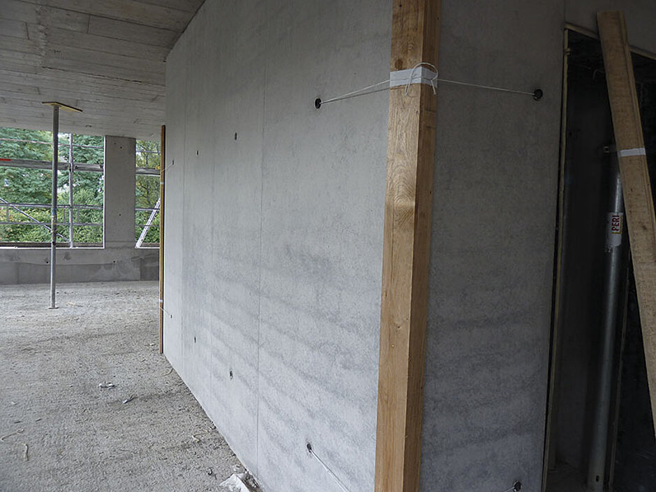 Belegt mit der gewünschten Schalhaut bot die Primax-Trägerschalung somit eine ideale Voraussetzung für Sichtbeton erster Güte. Dazu wurden aus den in 2,5 m und 4 m Höhe erhältlichen Grundrosten und Teleskoprosten mit verschraubten Kopf- und Gleitrahmen fertige Elemente vormontiert. So entstanden bis zu 6 m hohe Elemente, die mit passender Schalhaut belegt wurden (von hinten verschraubt).Für die Baustelle in Tübingen kamen Birkensperrholzplatten mit Phenolharzbeschichtung zum Einsatz. Aufgrund der hohen Anforderungen an die Betonflächen wurden diese nach rund acht Einsätzen ausgetauscht – eine Arbeit, die leicht auf der Baustelle zu erledigen war. Grundsätzlich erreicht die Primax ihre hohe Frischbetondruckaufnahme von bis zu 100 kN/m² mit einem extrem geringen Ankeranteil – im Idealfall sind nur 0,5 Anker/m² Wandfläche nötig, was entsprechend günstige Schalzeiten ergibt. An den kurzen und verwinkelten Wandabschnitten des Gebäudekerns waren diese optimalen Werte allerdings nicht zu schaffen.
