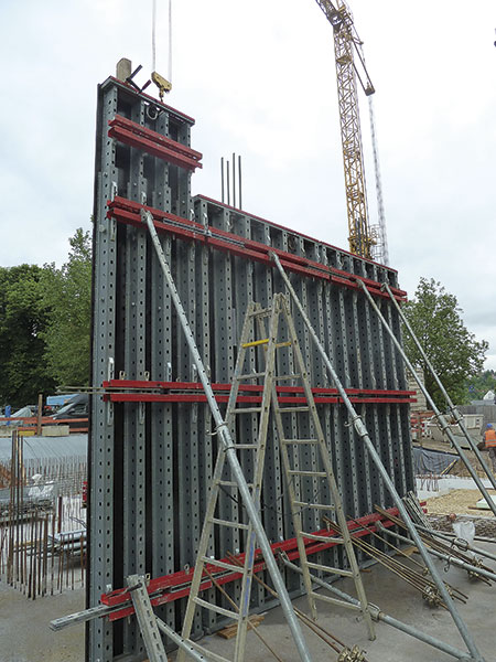 Die Primax-Stahlträgersystemschalung war für die in Tübingen eingesetzte F.K.-Mannschaft Neuland – bis die ersten Elemente der insgesamt rund 250 m² Schalungsvorhaltung angeliefert wurden. Dank umfassender Erfahrungen mit klassischen Holzträgerschalungen hatte das routinierte Schalungsteam von Polier Thomas Eichinger das neue System schnell »im Griff«, denn die Arbeitsabläufe beim Stellen und Ausrichten waren vergleichbar. Restmaßausgleich und Abschalungen erforderten eine sorgfältige Arbeitsvorbereitung, denn Improvisationen sind bei Sichtbetonanforderungen nicht ratsam. Die Primax-Trägerschalung punktet mit ihrer hohen Steifigkeit und Maßhaltigkeit, was für extrem ebene Betonwände steht. Mühelos können so die Ebenflächigkeitstoleranzen der DIN 18 202 Tabelle 3 Zeile 7 eingehalten werden.