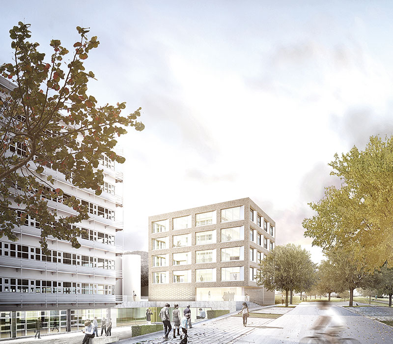 Der markante kubische Baukörper mit seinen großen Fensteröffnungen wird von der Eisenhutstraße aus über eine zum Hochparterre führende Freitreppe erschlossen. Bedingt durch die leichte Hanglage bildet das Untergeschoss eine Art Souterrain, das über ein verglastes Verbindungsbauwerk an das bestehende Verwaltungsgebäude der Stadtwerke angeschlossen ist. Die insgesamt sechs Stockwerke haben die Architekten mit Höhen zwischen 3,5 m und 4,5 m festgelegt, und die Wände des Gebäudekerns – insgesamt 2 400 m² Wandfläche – zum Teil in Sichtbeton SB3 ausgeschrieben.