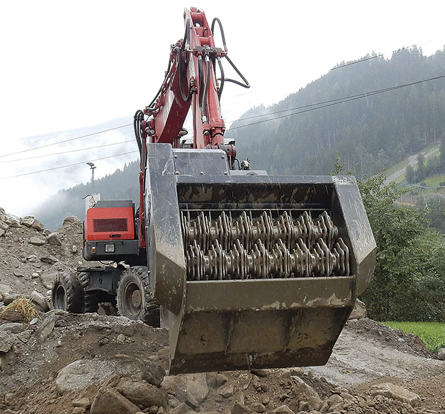 Mit den SIMEX-Sieblöffeln können unter anderem Erdreich, Stabilisierungsmaterial oder auch Baustellenschutt gesiebt werden. Die Siebweite lässt sich im Bereich von bis zu 40 mm stufenlos aus der Fahrerkabine einstellen.