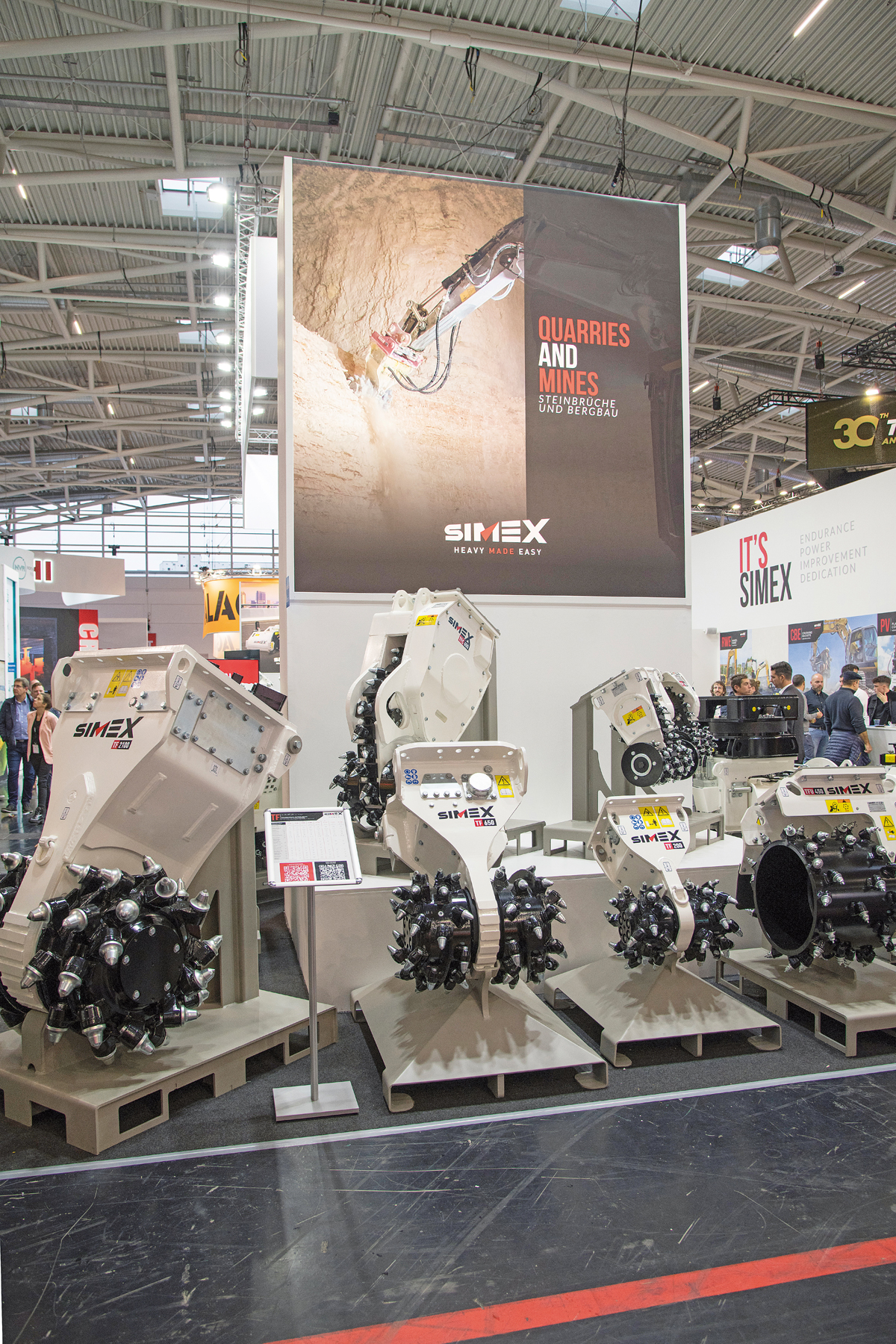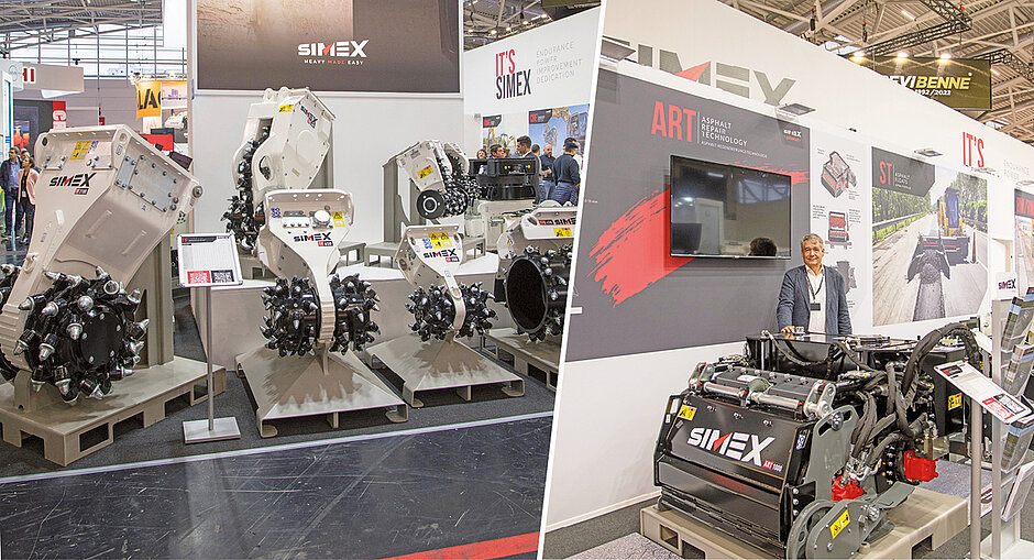 Neben dieser Neuheit und seinen bewährten Anbaufräsen zeigte Simex in München Anbauwerkzeuge, die den Abbruch und das Recycling von Abfallmaterial erleichtern. Dazu gehören u. a. die Sieblöffel der VSE-Reihe. Zu dem exklusiven Patent für die sofortige Veränderung der Ausgangsgröße des gesiebten Materials ist ein weiteres Patent hinzugekommen, nämlich die neuen FIT-Siebwerkzeuge. Diese leicht anpassbaren und direkt vor Ort austauschbaren Werkzeuge reduzieren laut Simex die Wartungskosten um bis zu 75 %.