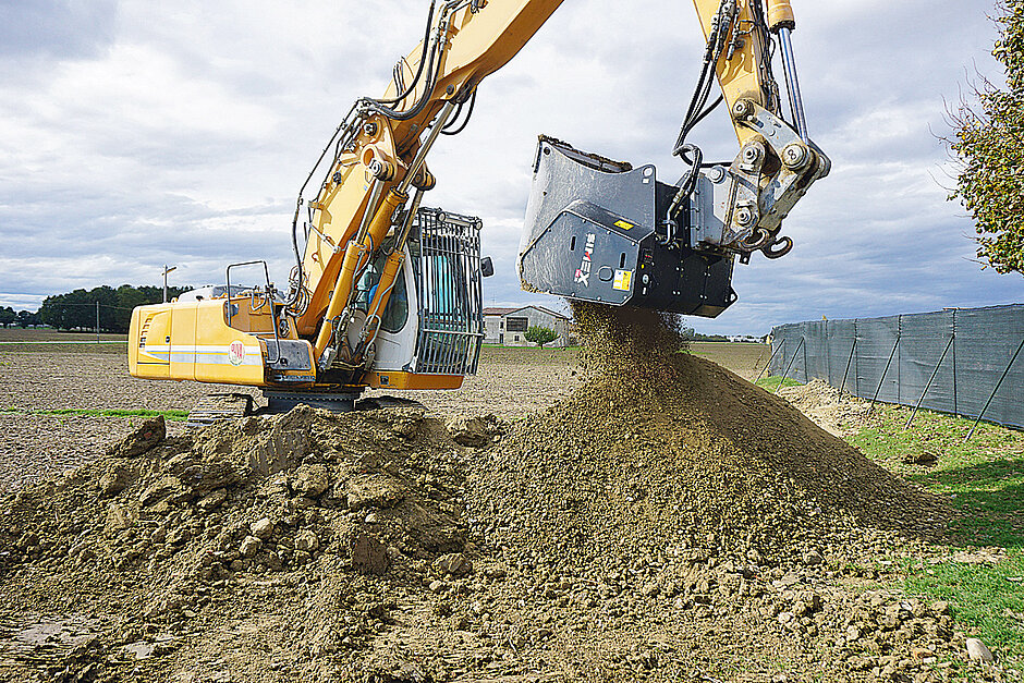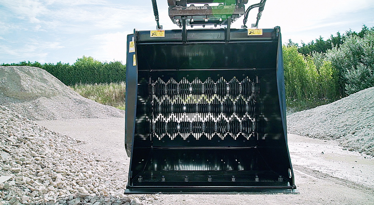 Eine Löffelfüllung so separieren, dass man drei oder mehrere Materialkörnungen nebeneinander anhäuft: Die in vier Modellen für Bagger von 8 t bis 45 t erhältlichen VSE-Sieblöffel von Simex sollen sich durch eine schnelle Einstellung der Durchsatzleistung direkt aus der Kabine auszeichnen. Ohne das Fahrerhaus zu verlassen, kann die Siebgröße stufenlos hydraulisch um 40 mm verändert werden. So kann der Bediener dank der sofortigen Änderung der Ausgabegröße drei verschiedene Körnungen erhalten: eine feine Körnung 0 – 15 mm, eine mittlere 15 – 55 mm und eine grobe Körnung mit mehr als 55 mm.