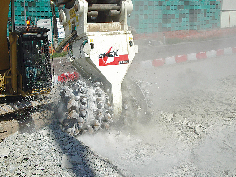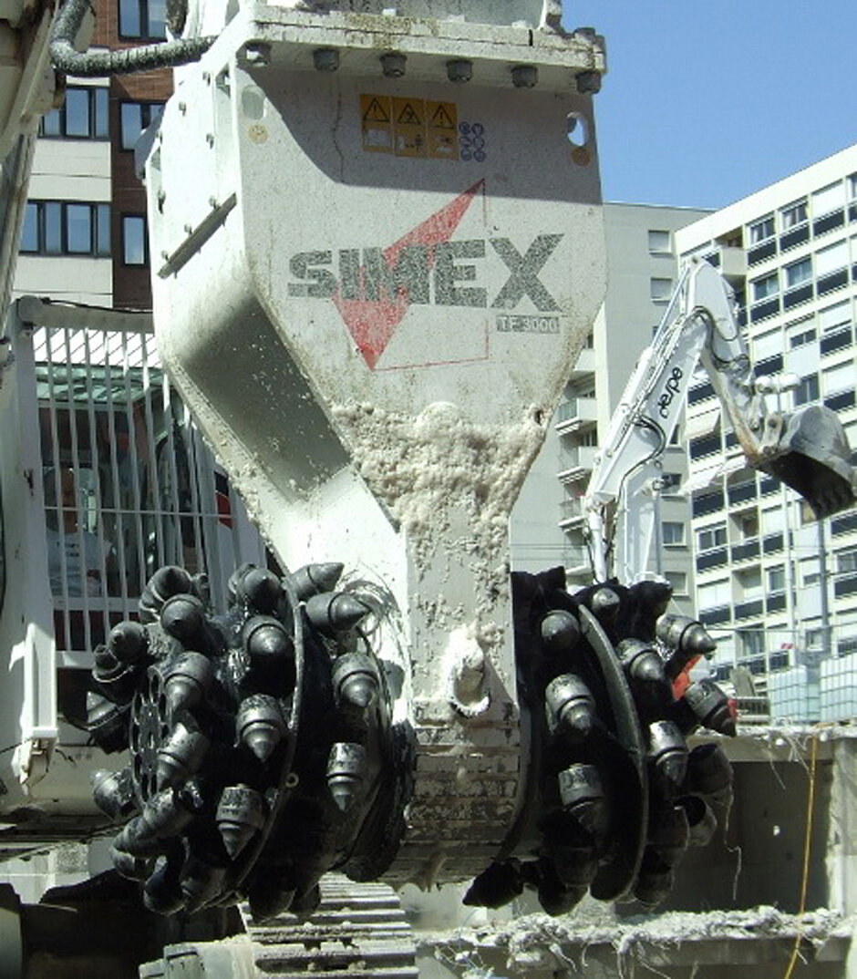 Sind große Abbrucheinsätze gefordert, bietet Simex Fräsen für Bagger von 18 t bis 90 t an. Für spezielle Situationen ist der Einsatz dieser Geräte meist unumgänglich, so kann die Aufbereitung von Betonstrukturen mit einem hohen Armierungsanteil weitaus produktiver mit einer Fräse als mit einem Hammer durchgeführt werden. Bei Abbrüchen in Wohngebieten belastet eine Fräse die Anlieger weniger als der Einsatz eines Hammers.